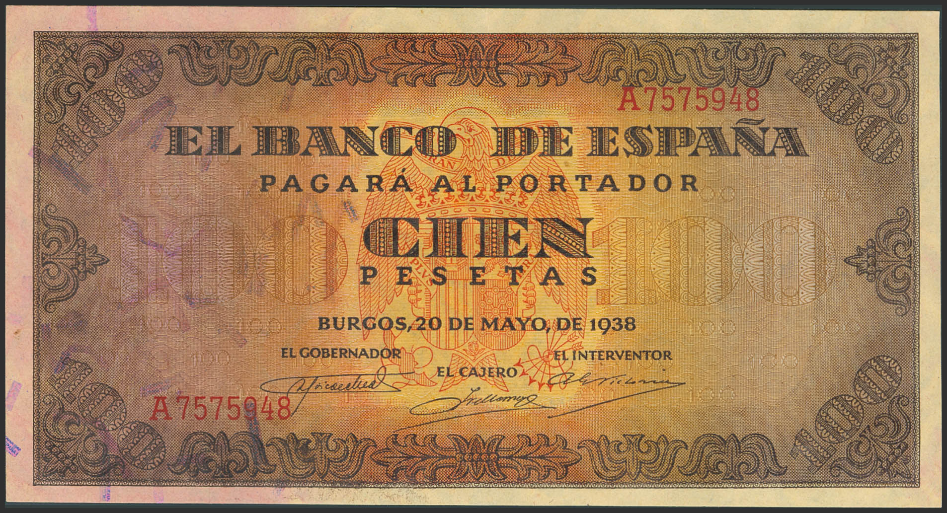 100 Pesetas. 20 de Mayo de 1938. Serie A. (Edifil 2023: 432). Apresto original. EBC++.