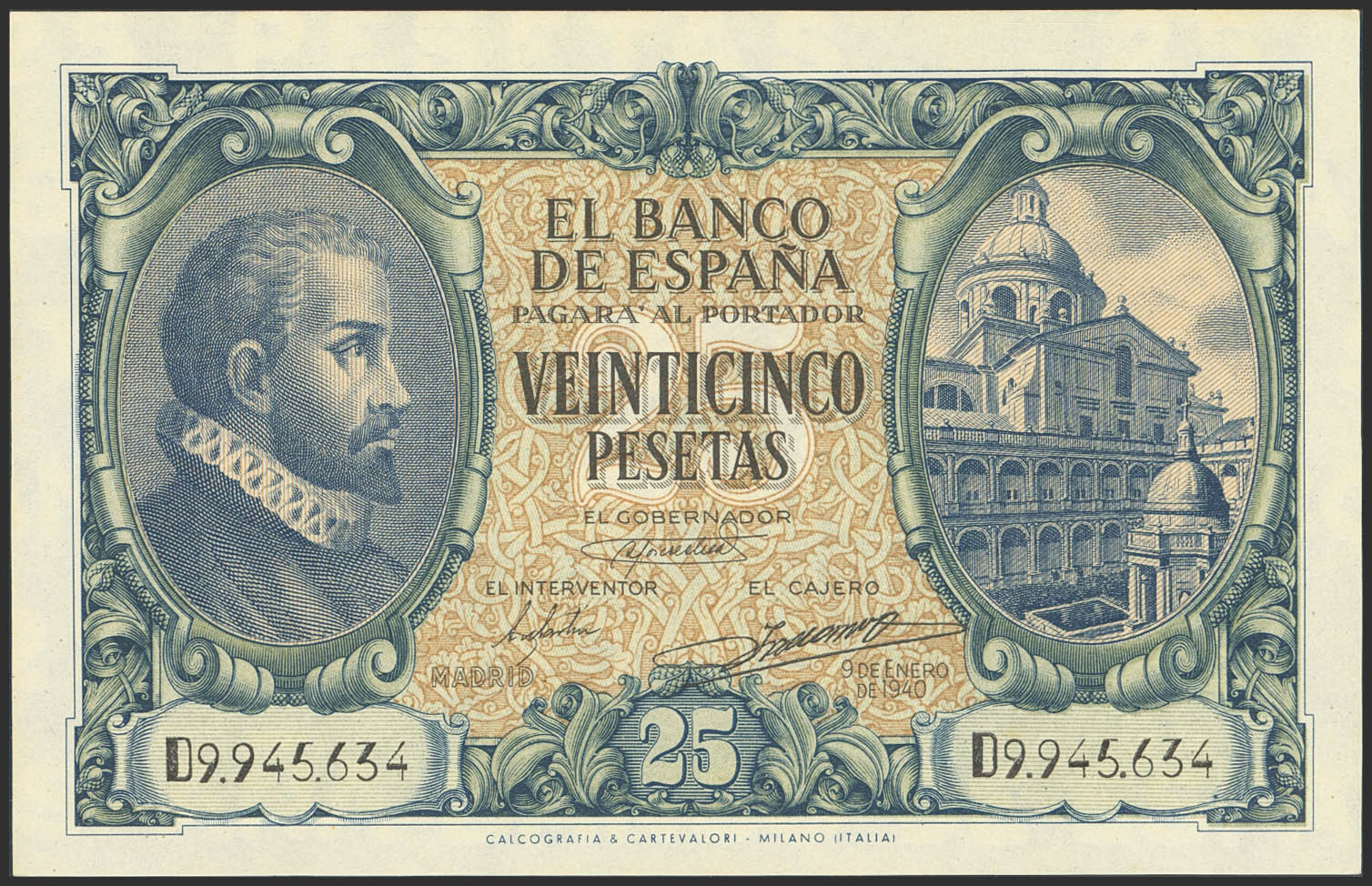 25 Pesetas. 9 de Enero de 1940. Serie D. (Edifil 2023: 436a). Apresto original. SC.
