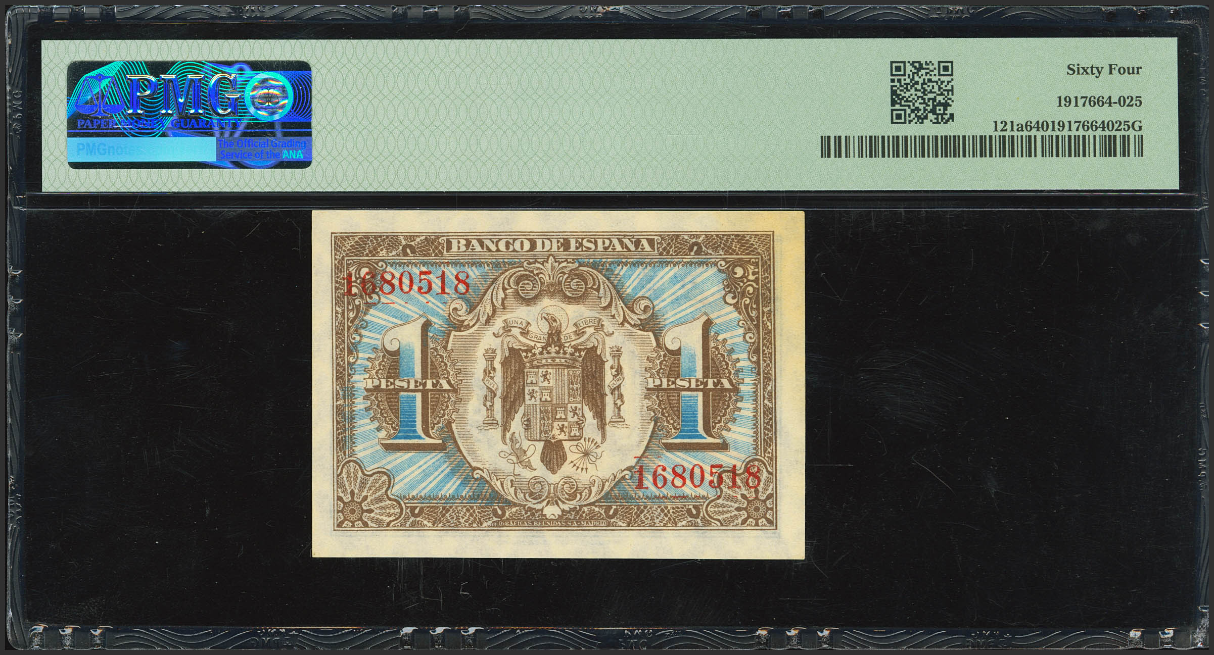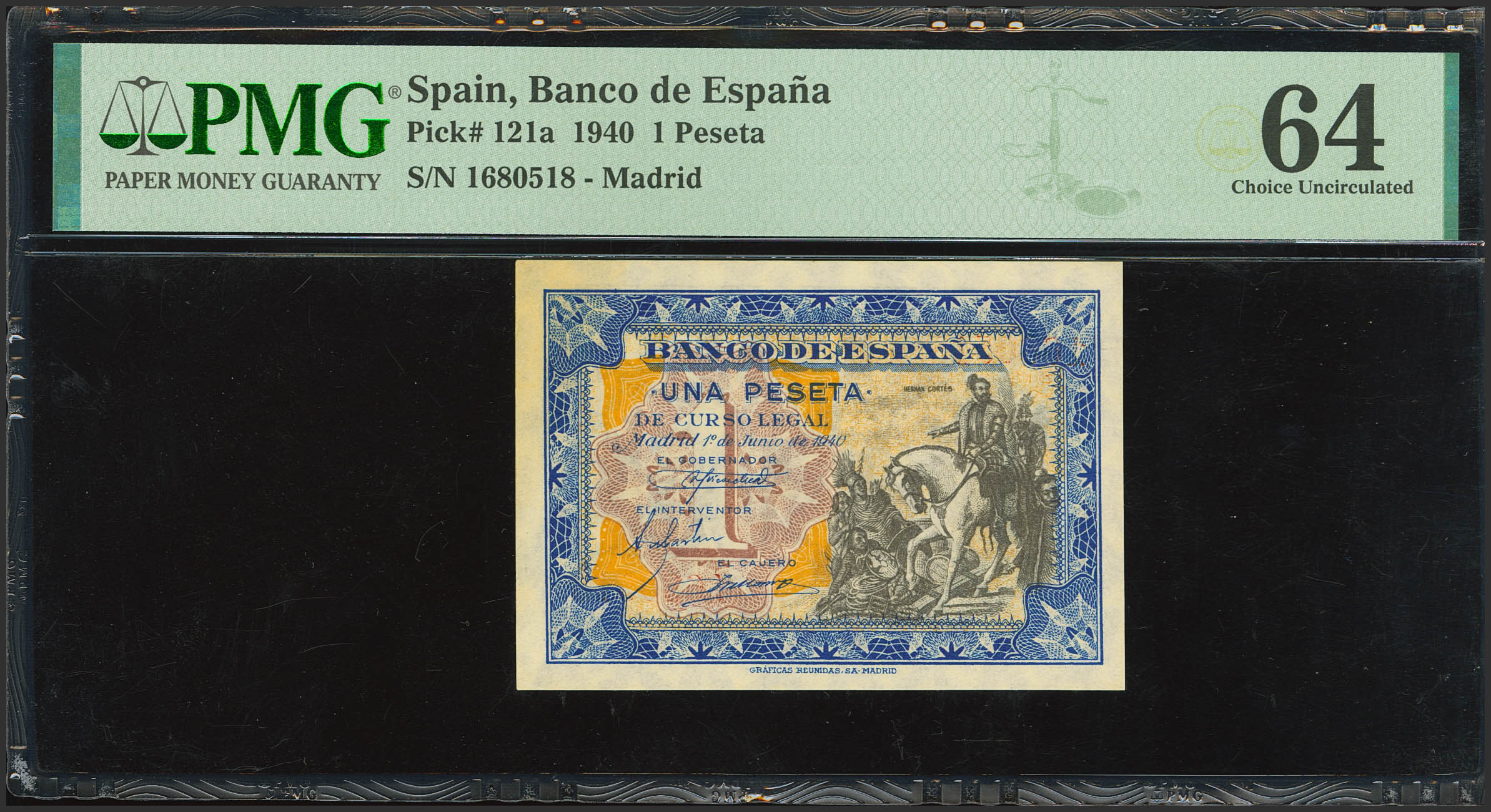 1 Peseta. 1 de Junio de 1940. Sin serie. (Edifil 2021: 441, Pick: 121a). Inusual. SC. Encapsulado PMG64.