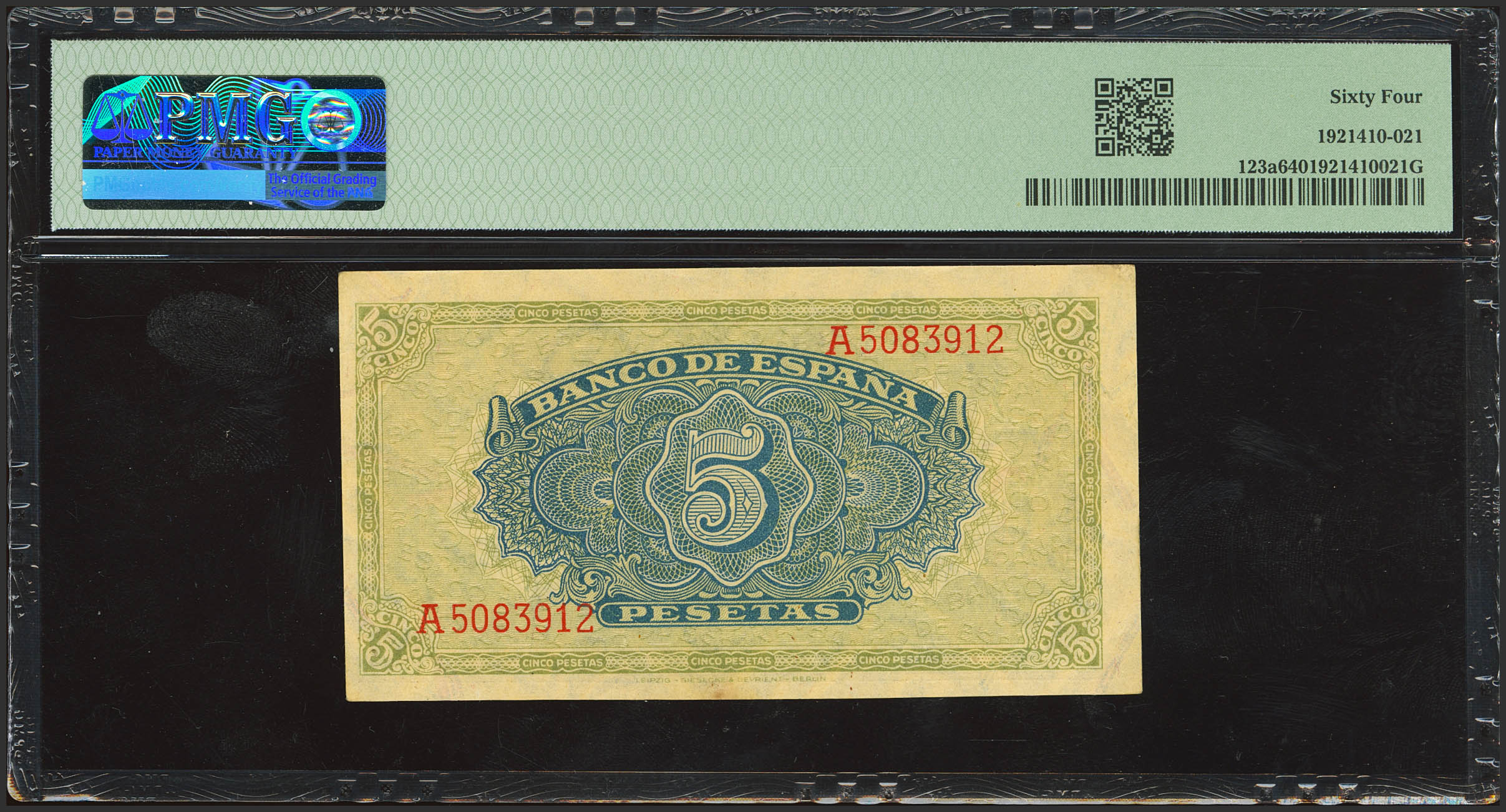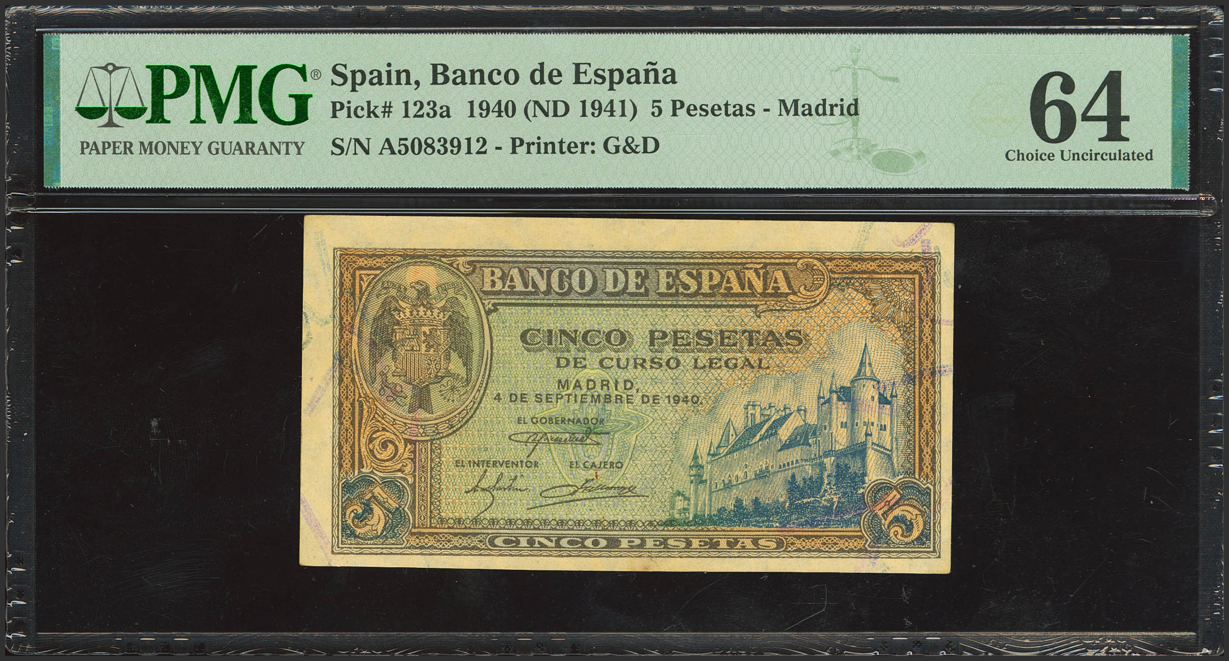 5 Pesetas. 4 de Septiembre de 1940. Serie A. (Edifil 2023: 443, Pick: 123a). SC. Encapsulado PMG64