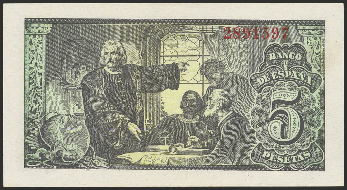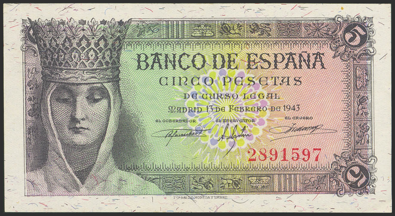 5 Pesetas. 13 de Febrero de 1943. Sin serie. (Edifil 2023: 446). Apresto original. SC-.