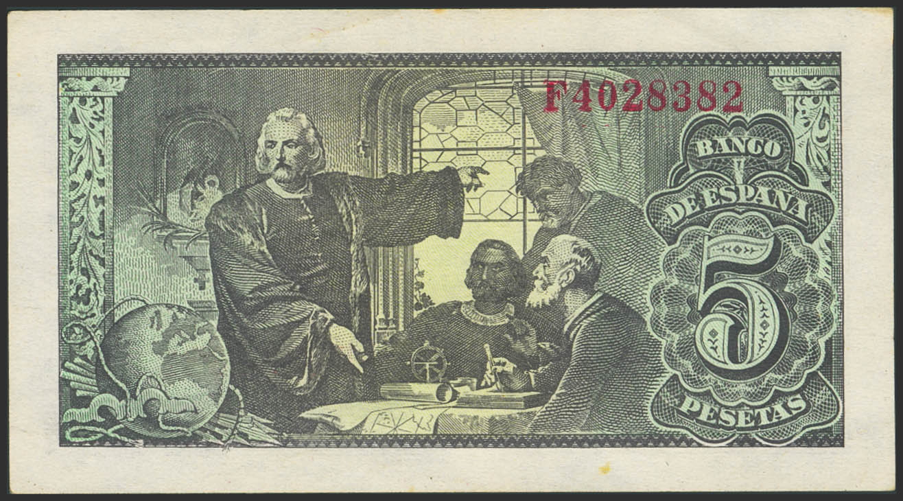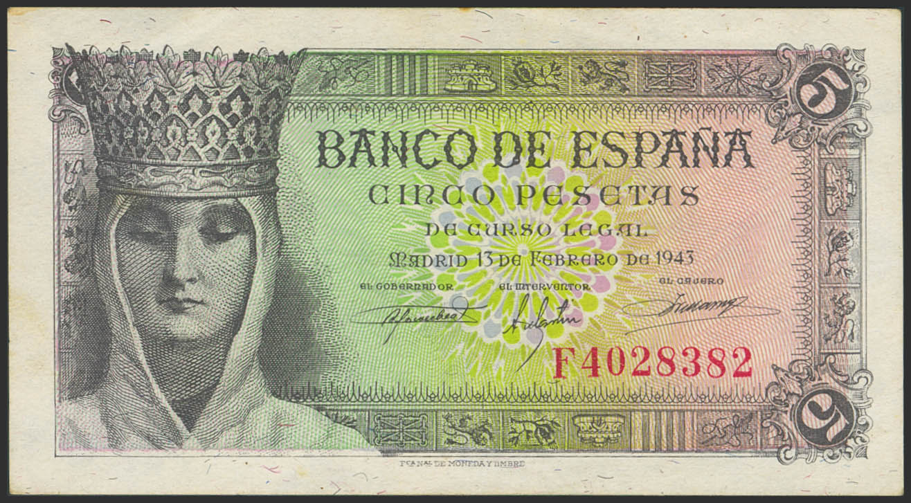 5 Pesetas. 13 de Febrero de 1943. Serie F. (Edifil 2023: 446a). Apresto original. EBC+++.