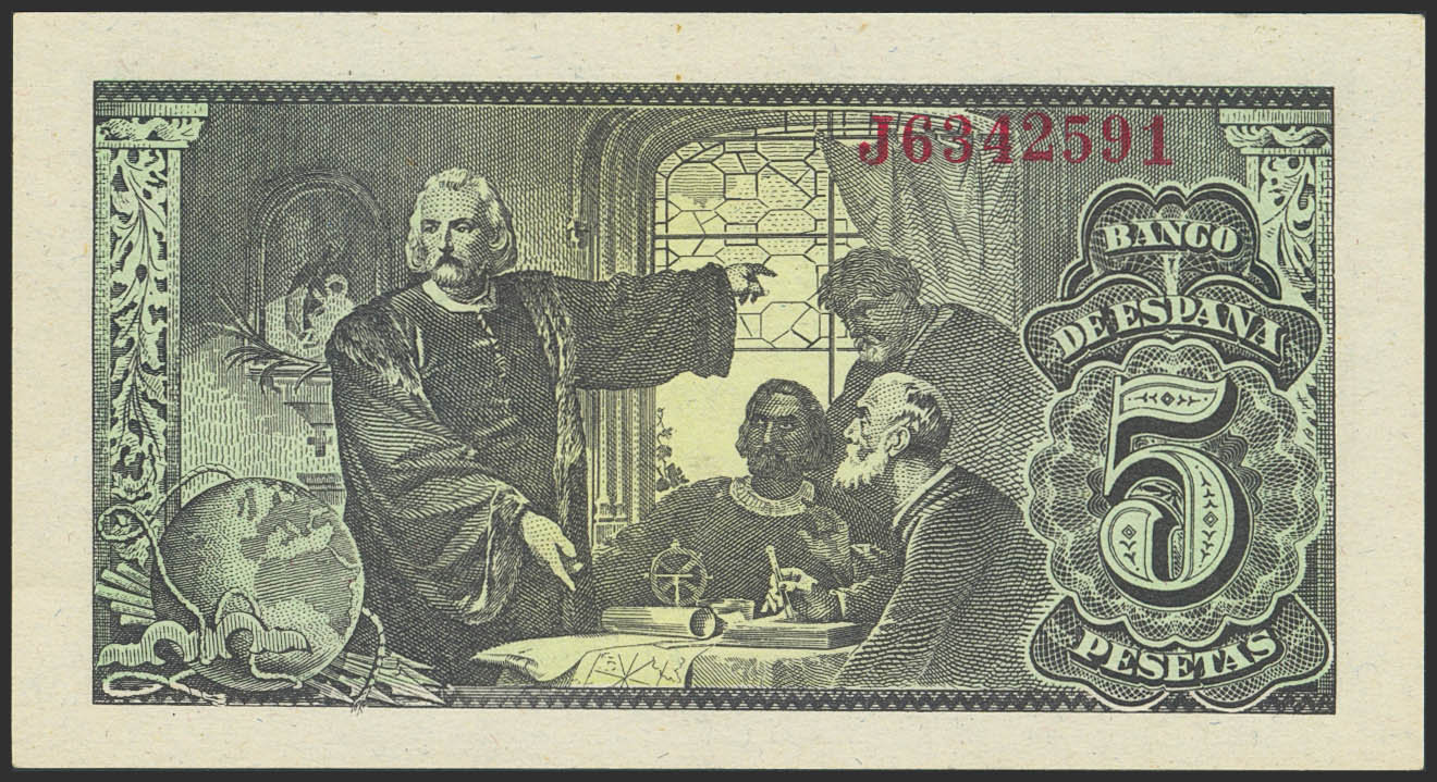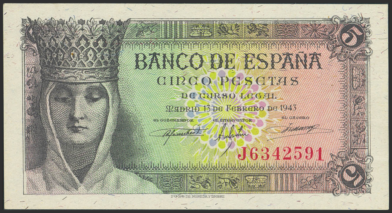 5 Pesetas. 13 de Febrero de 1943. Serie J, última serie emitida. (Edifil 2023: 446b). Apresto original. SC-.