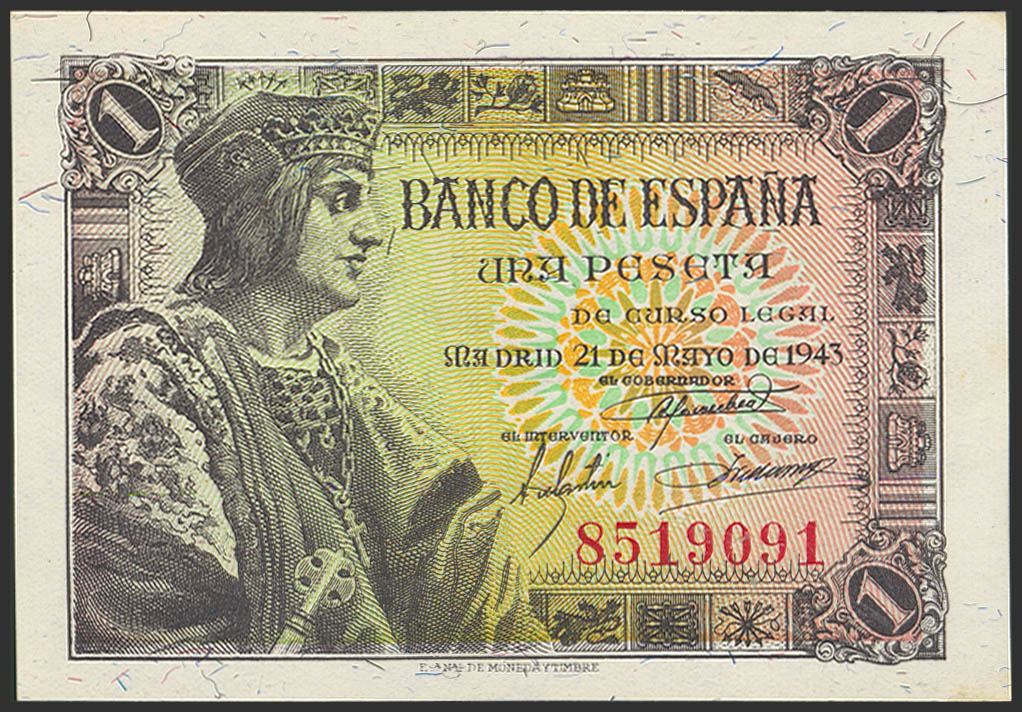 1 Peseta. 21 de Mayo de 1943. Sin serie. (Edifil 2023: 447). Apresto original. SC-.