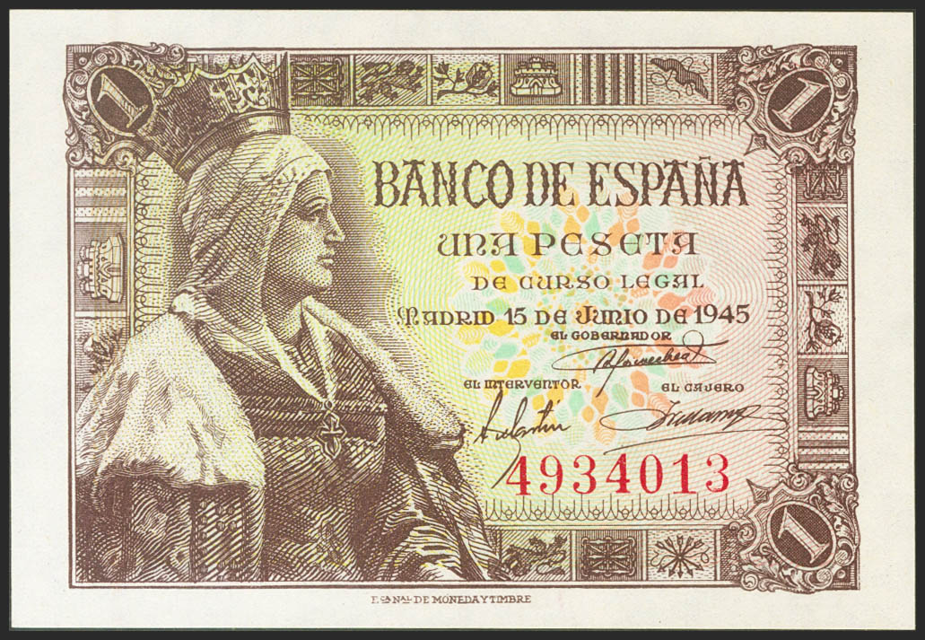 1 Peseta. 15 de Junio de 1945. Sin serie. (Edifil 2021: 448). Apresto original. SC-.