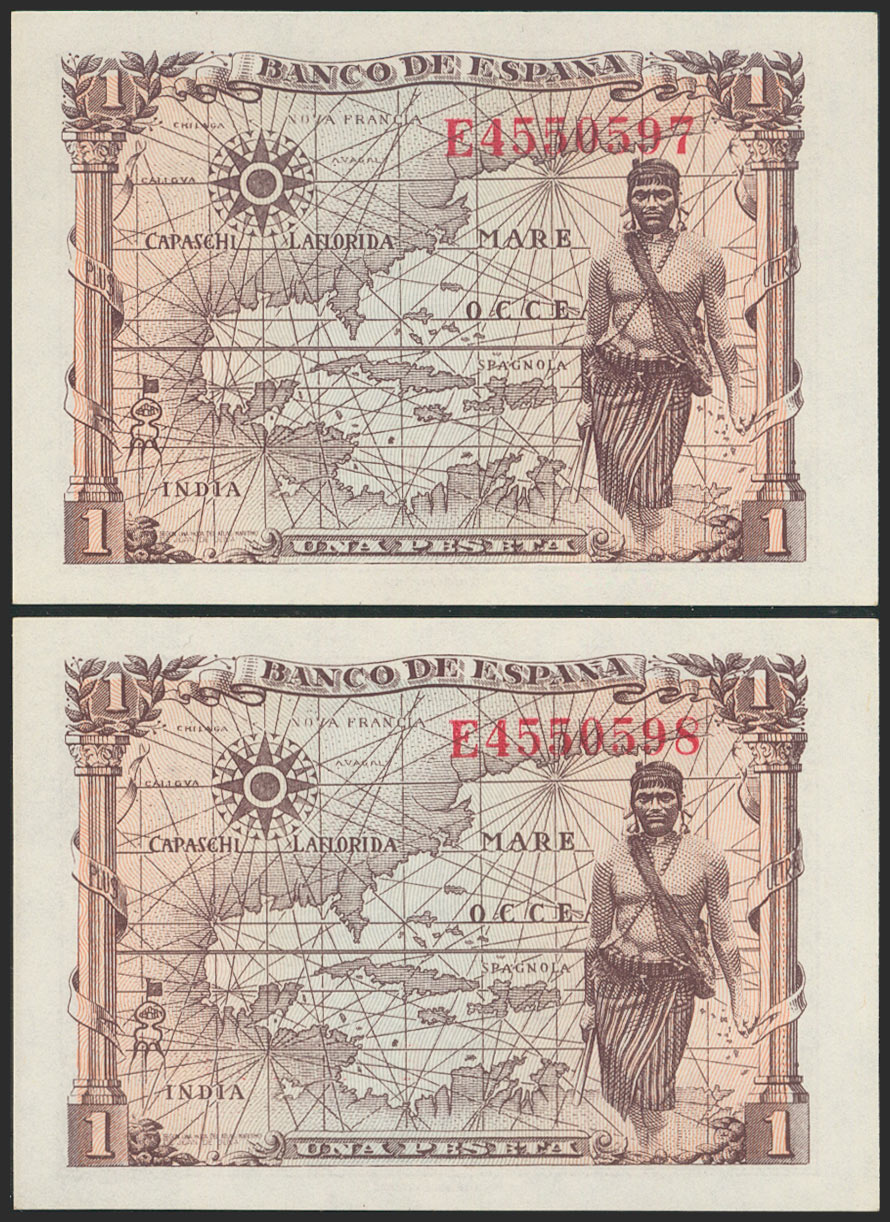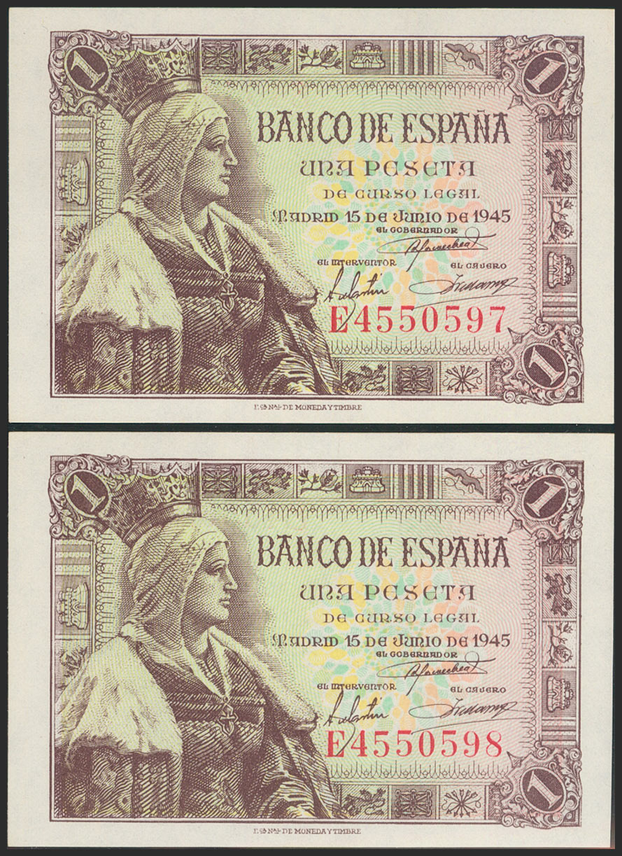 1 Peseta. 15 de Junio de 1945. Pareja correlativa. Serie E. (Edifil 2021: 448a). Apresto original. SC.