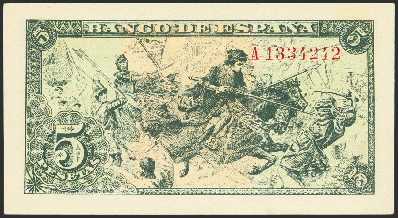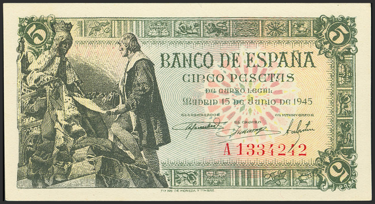 5 Pesetas. 15 de Junio de 1945. Falso de Epoca. Serie A. (Edifil 2023: 449F, Cobo: 45). Apresto original. SC.