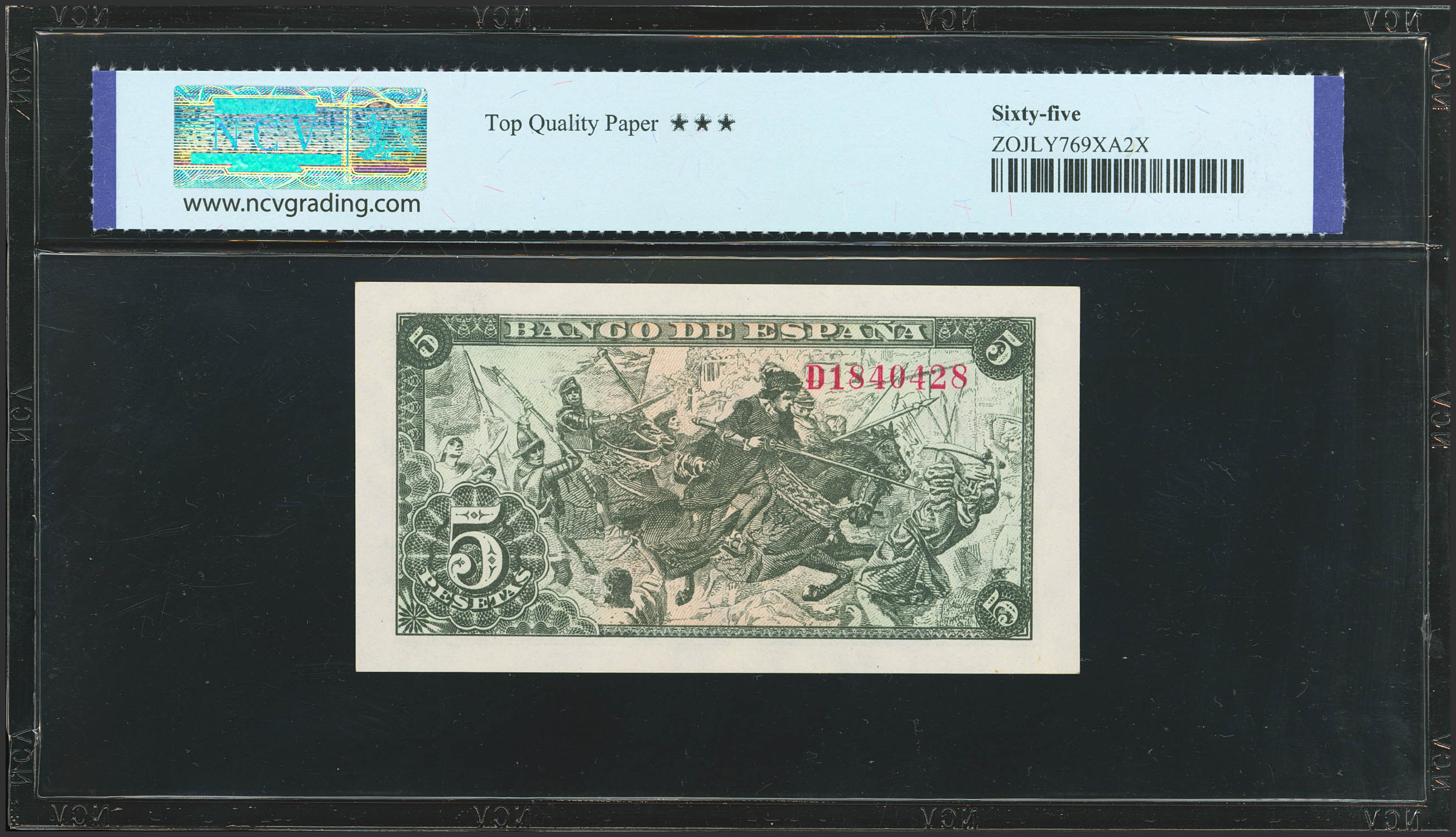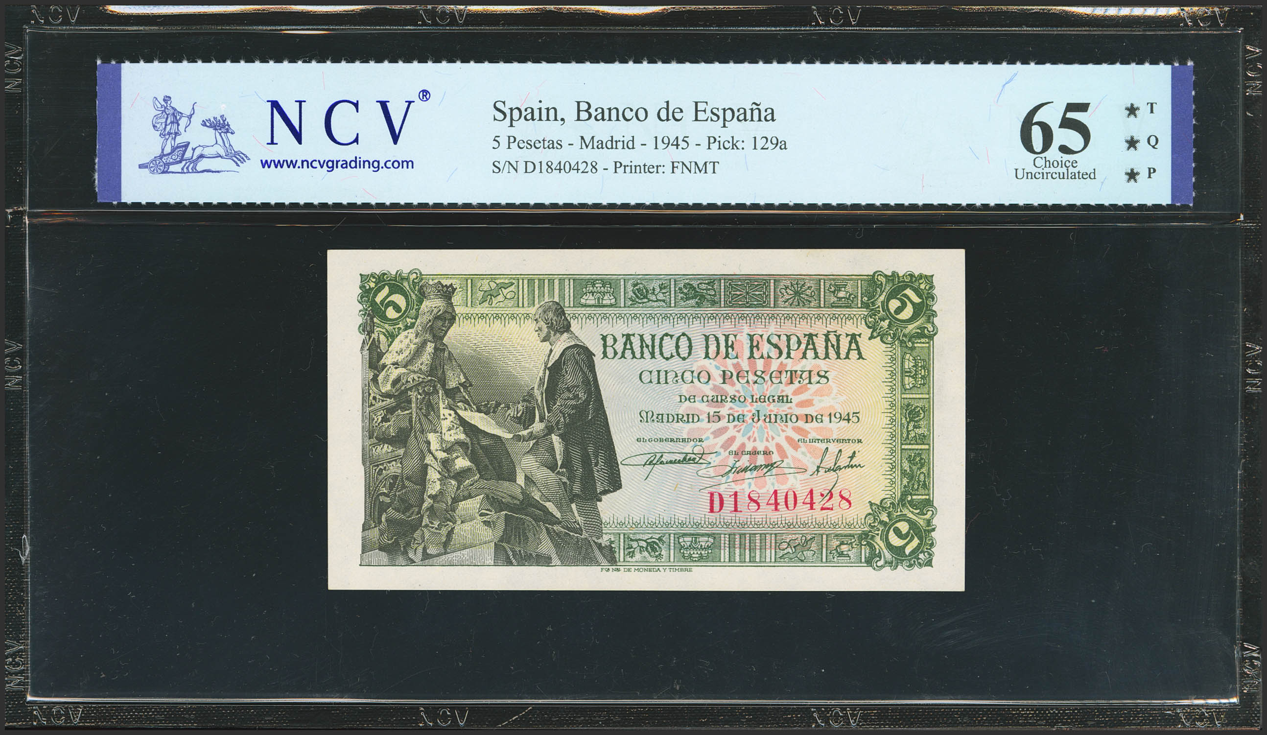 5 Pesetas. 15 de Julio de 1945. Serie D. (Edifil 2023: 449a, Pick: 129a). Apresto original. SC. Encapsulado NCV65TQP.