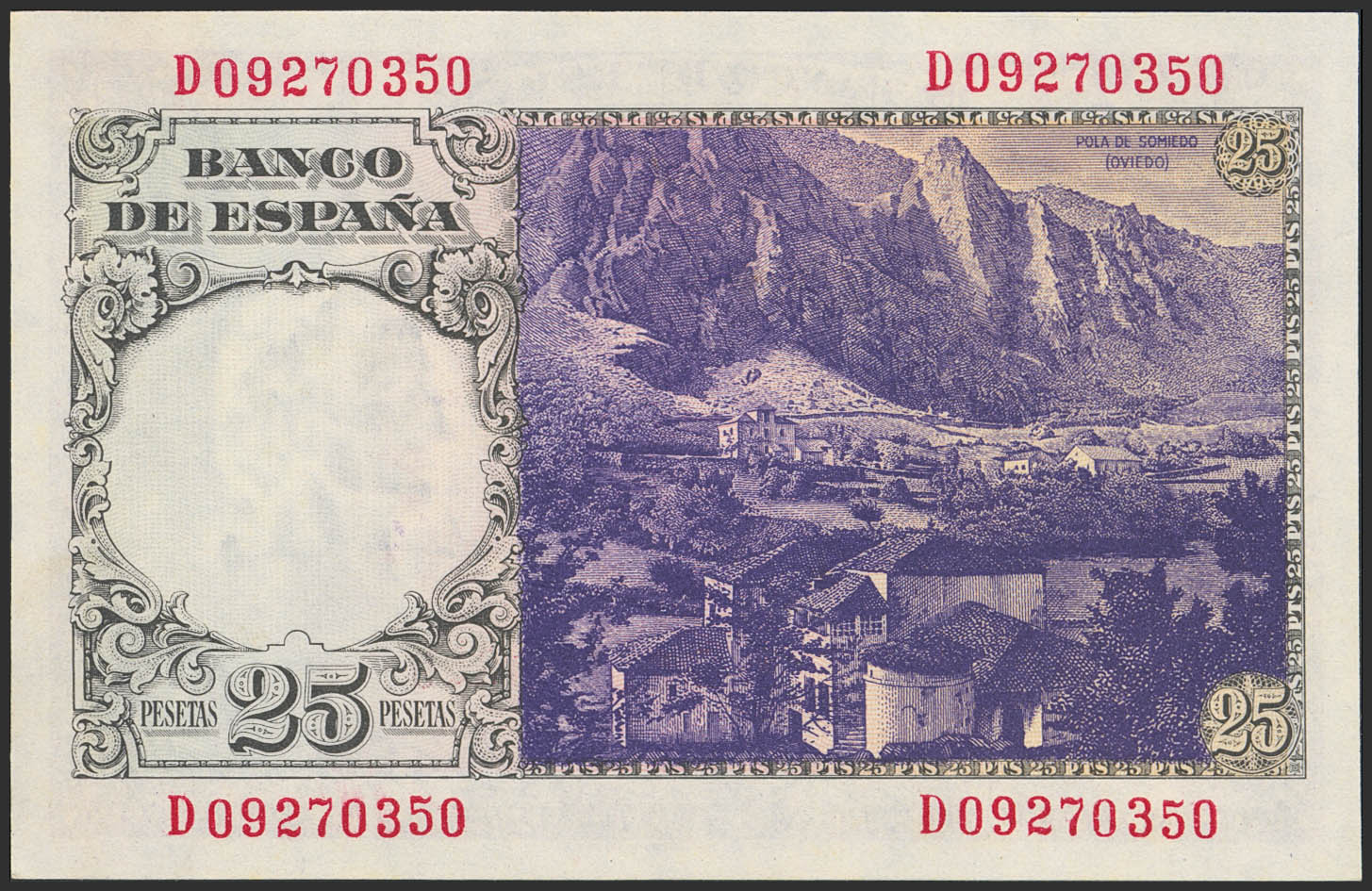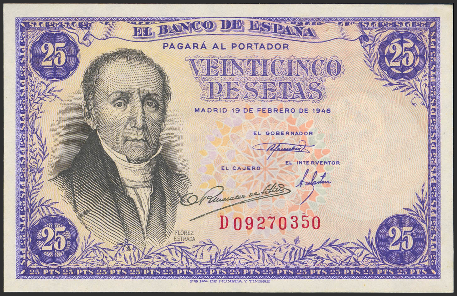 25 Pesetas. 19 de Febrero de 1946. Serie D. (Edifil 2023: 450a). Apresto original. SC.