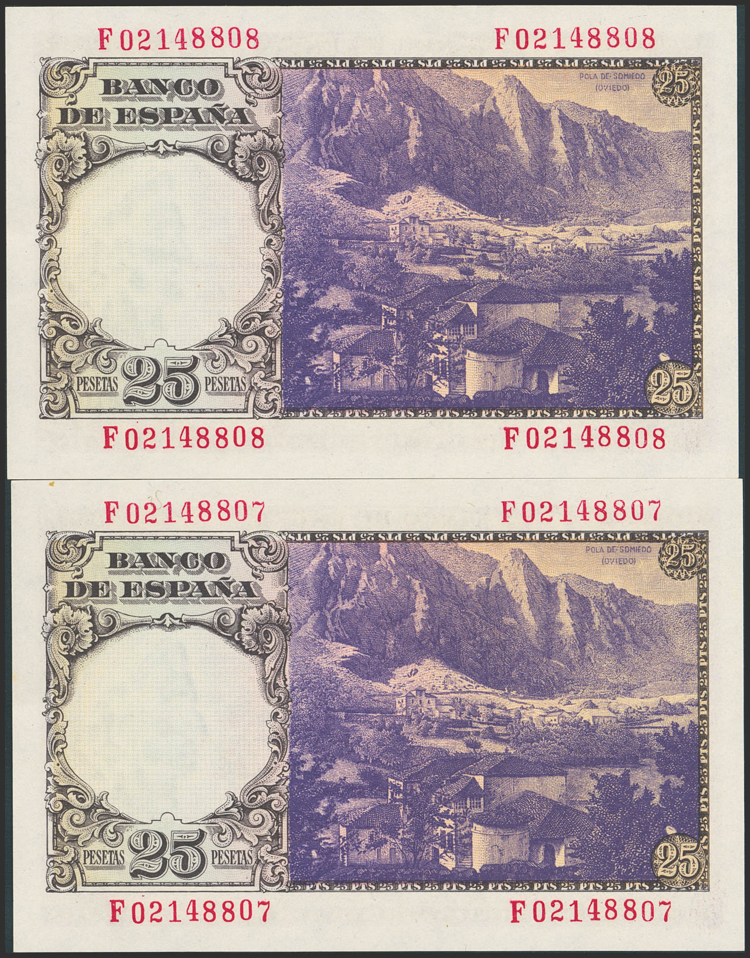 25 Pesetas. 19 de Febrero de 1946. Pareja correlativa. Serie F. (Edifil 2023: 450a). Apresto original. SC-.