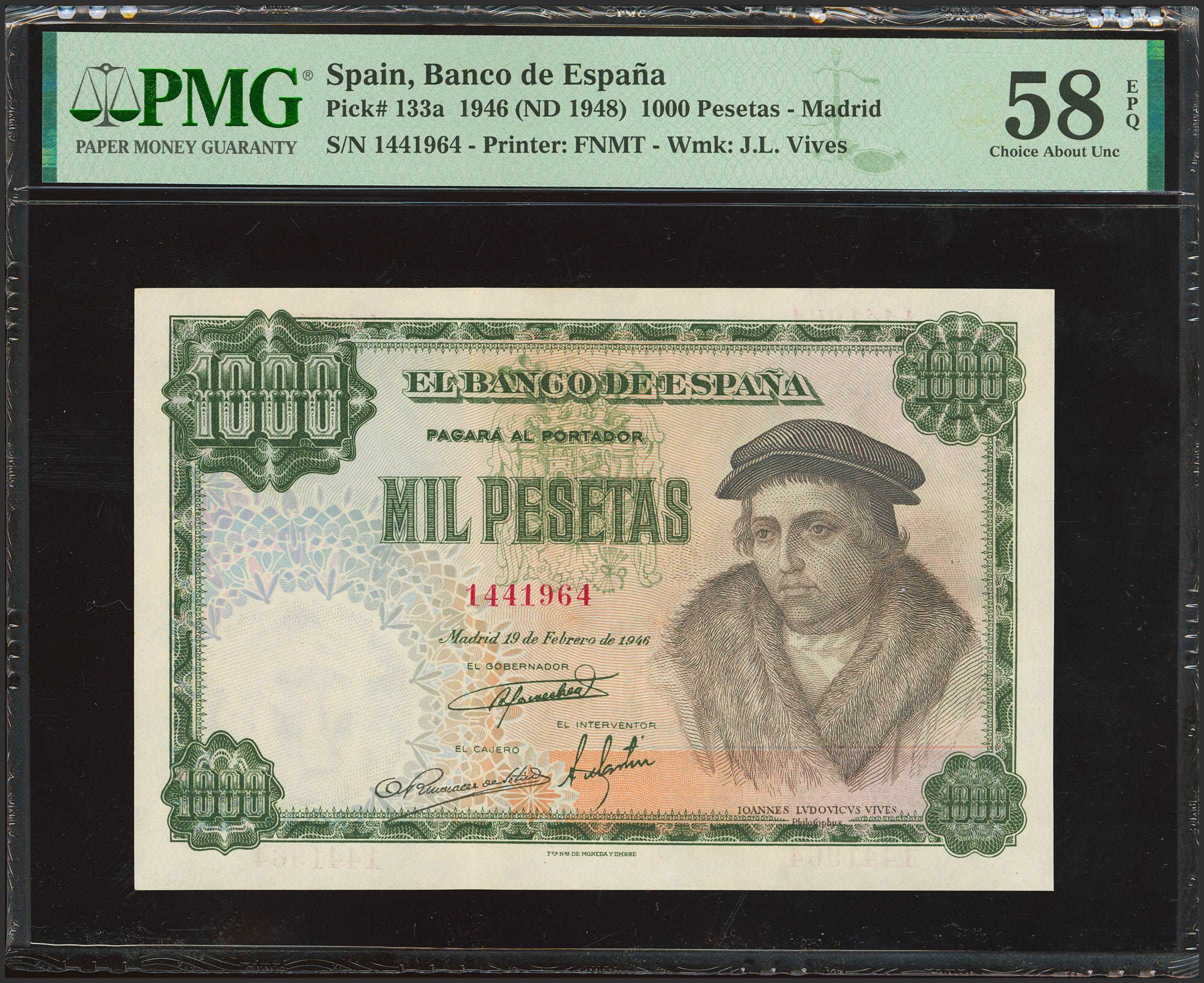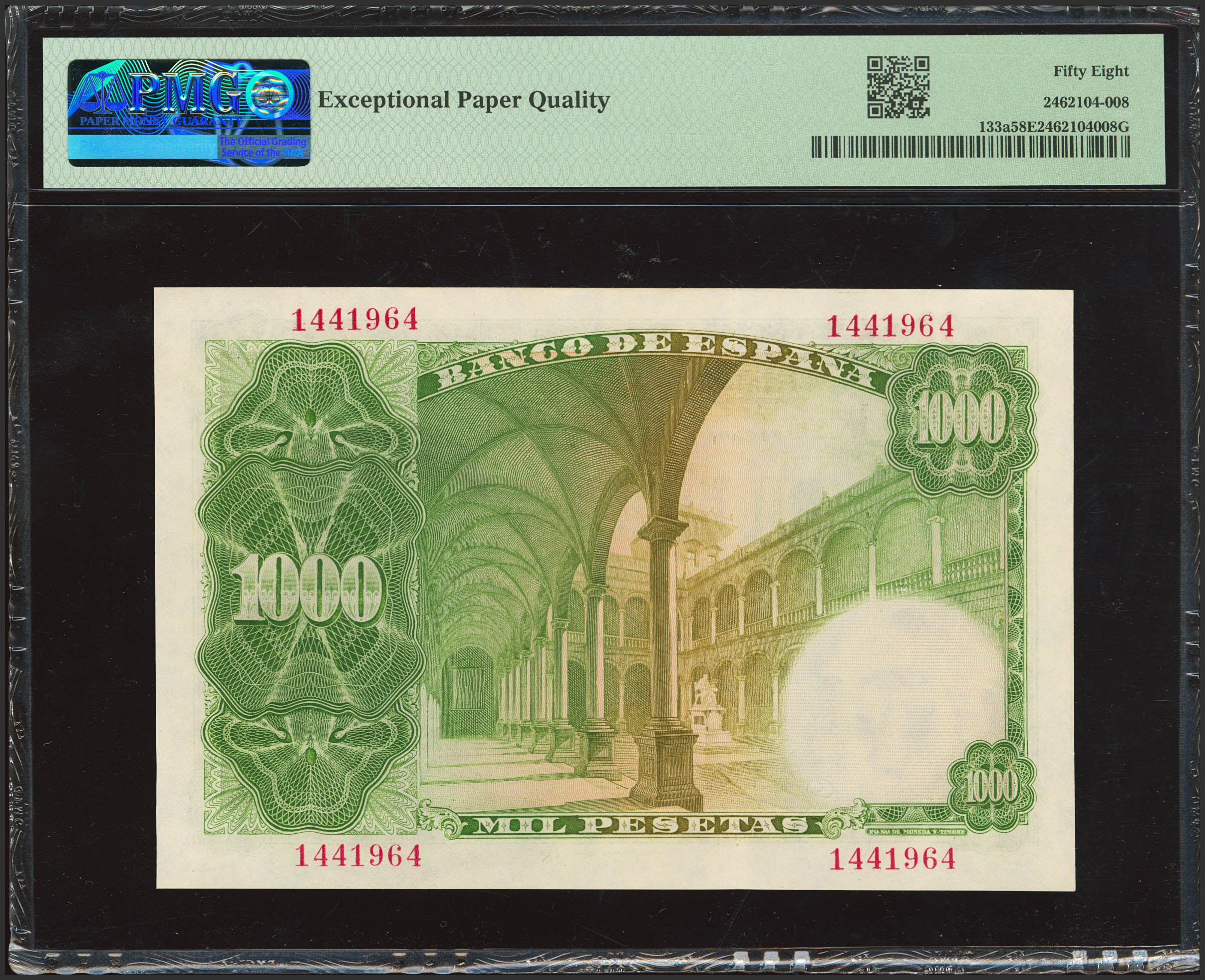 1000 Pesetas. 19 de Febrero de 1946. Sin serie. (Edifil 2023: 453, Pick: 133a). Raro en esta calidad, apresto original. EBC+++. Encapsulado PMG58EPQ.