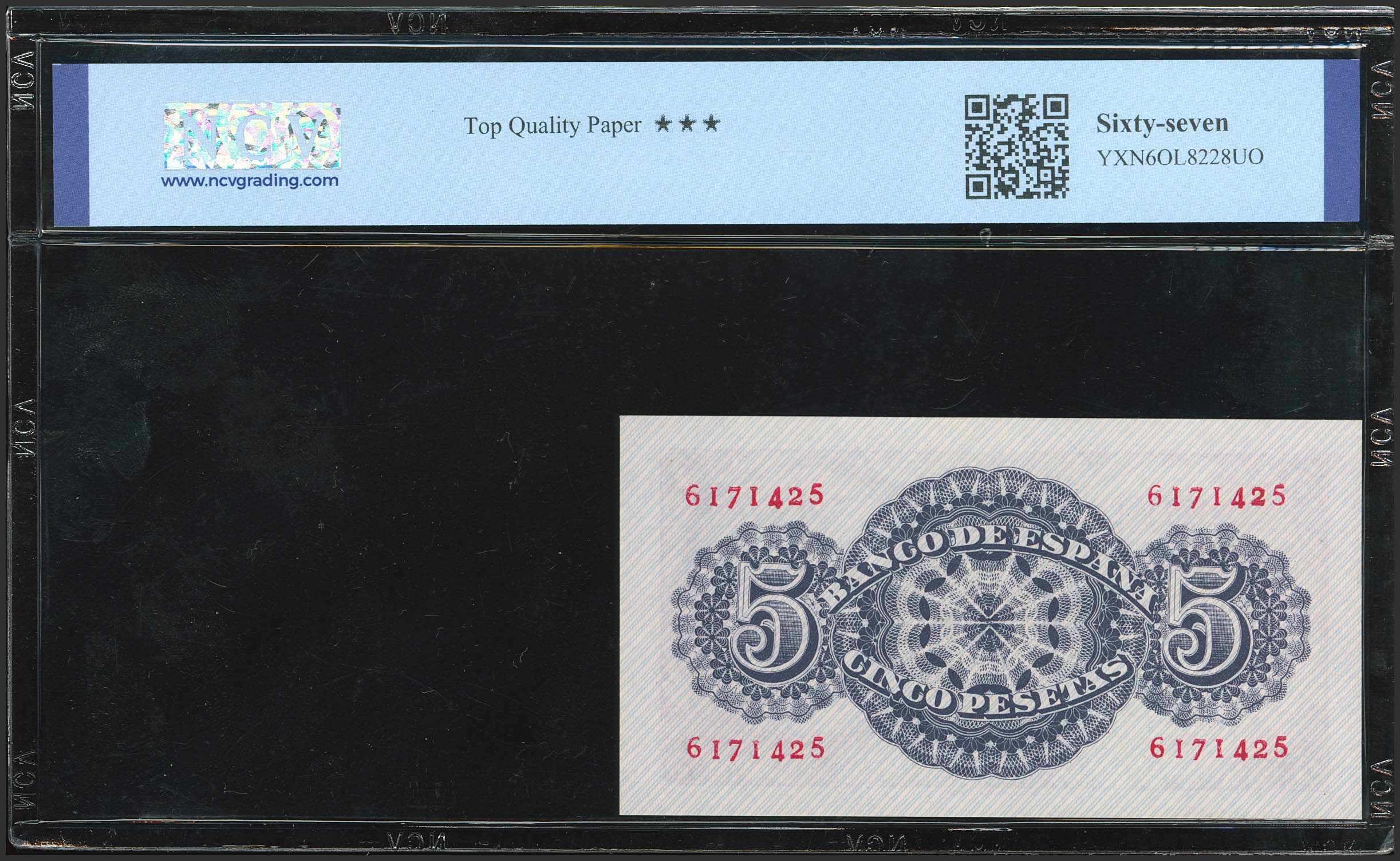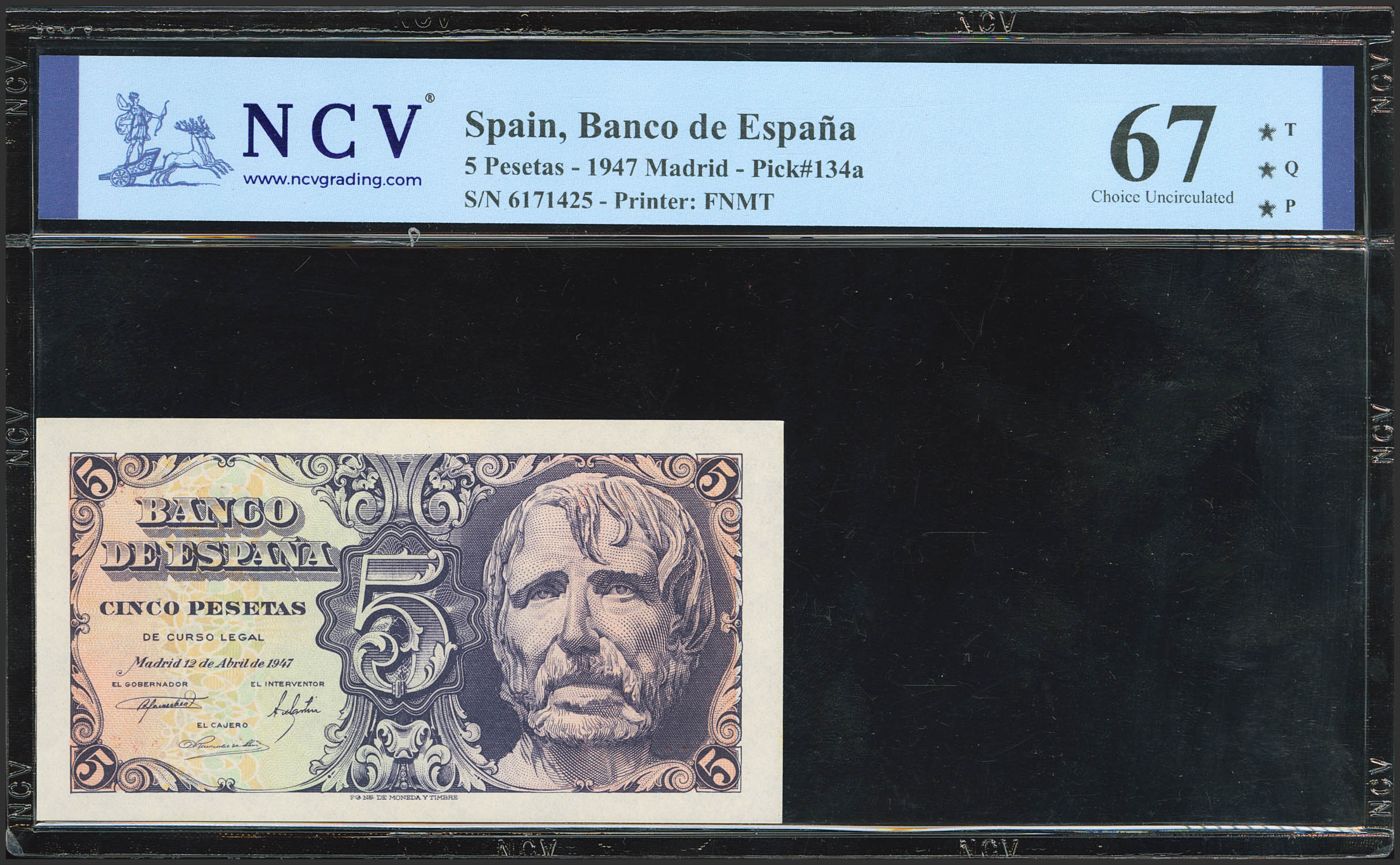 5 Pesetas. 12 de Abril de 1947. Sin serie. (Edifil 2023: 454, Pick: 134a). Inusual en esta excepcional calidad, apresto original. SC. Encapsulado NCV67TQP.