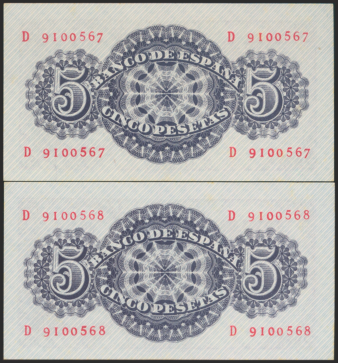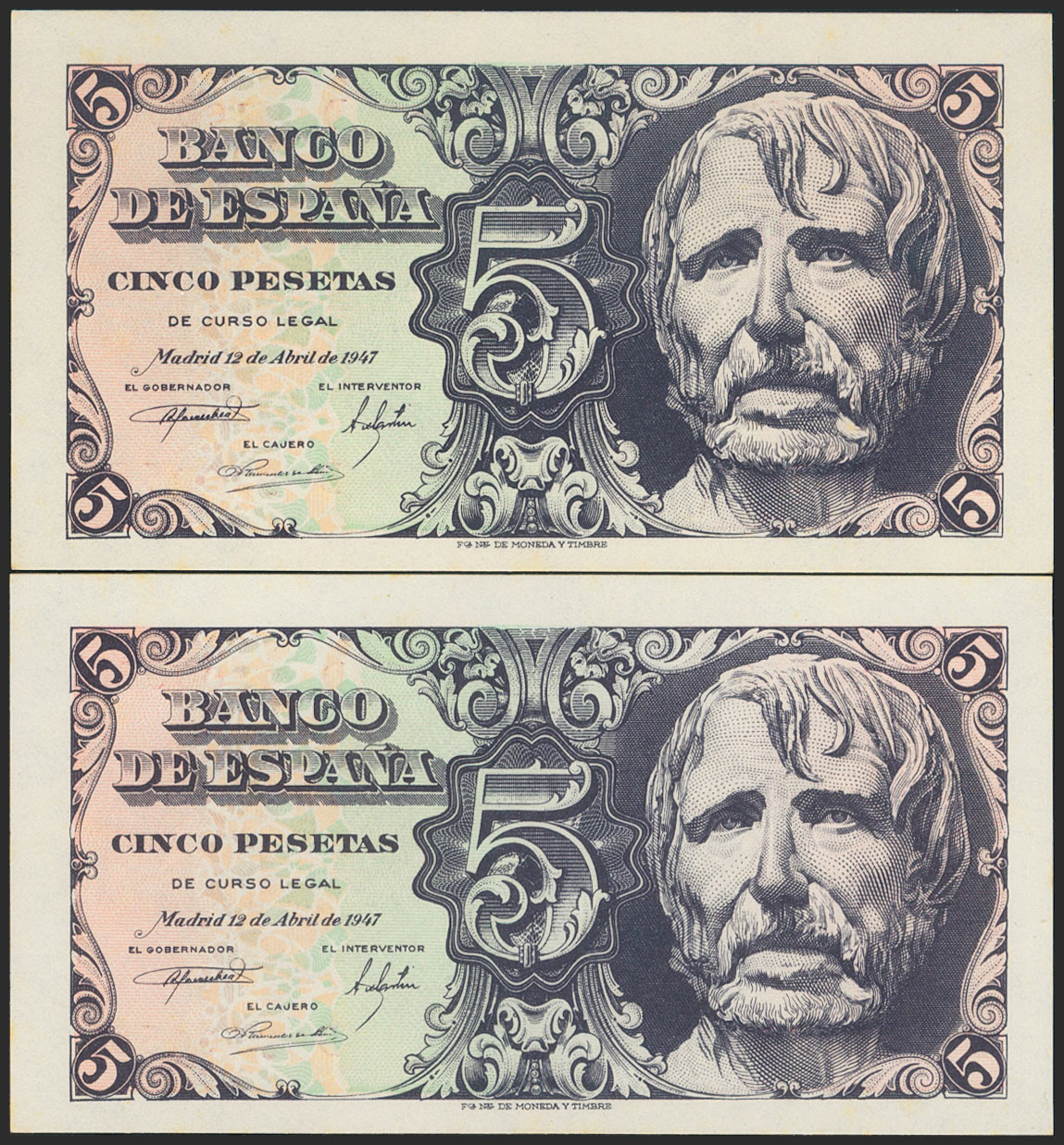 5 Pesetas. 12 de Abril de 1947. Pareja correlativa. Serie D. (Edifil 2021: 454a). Apresto original. SC-.