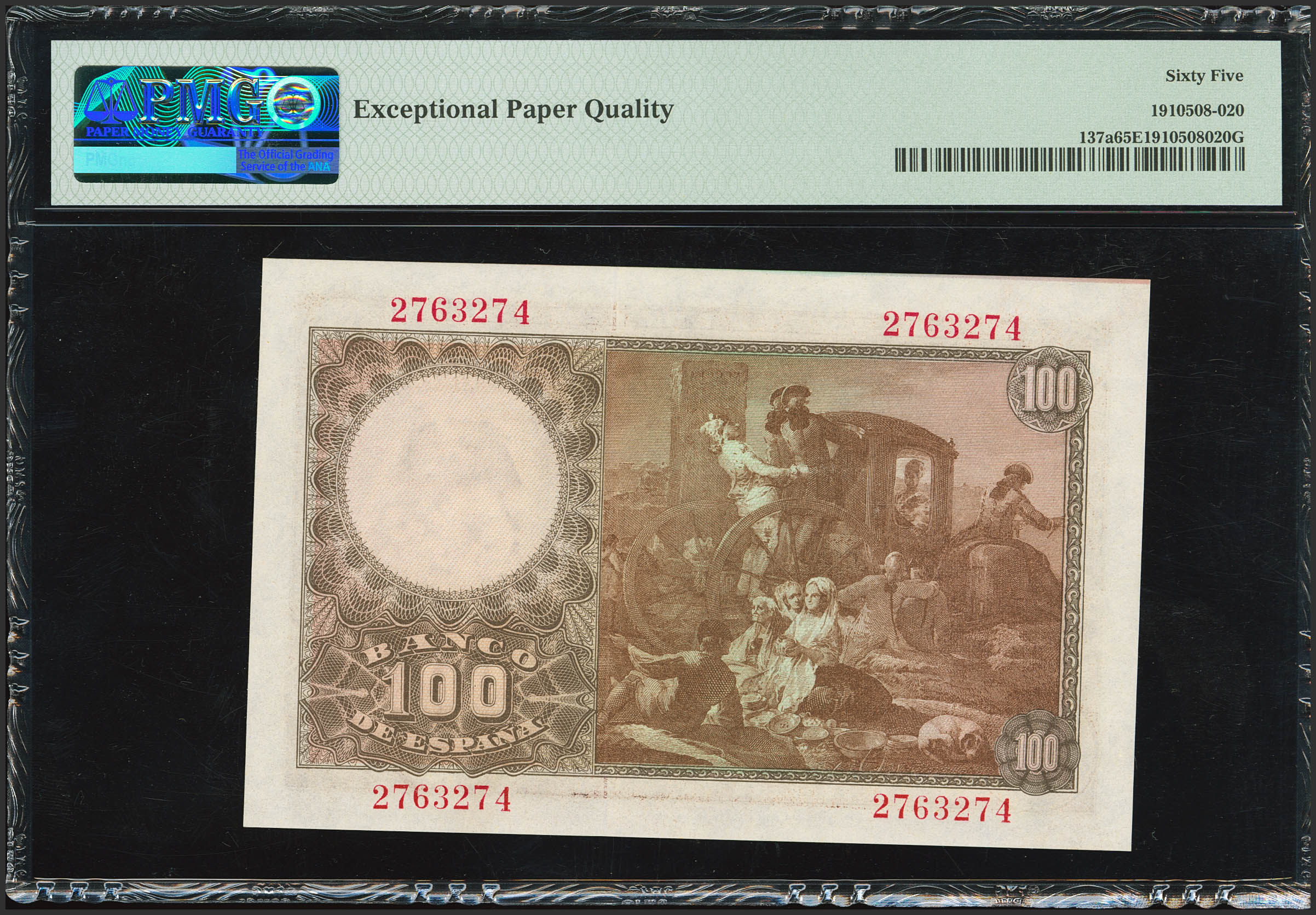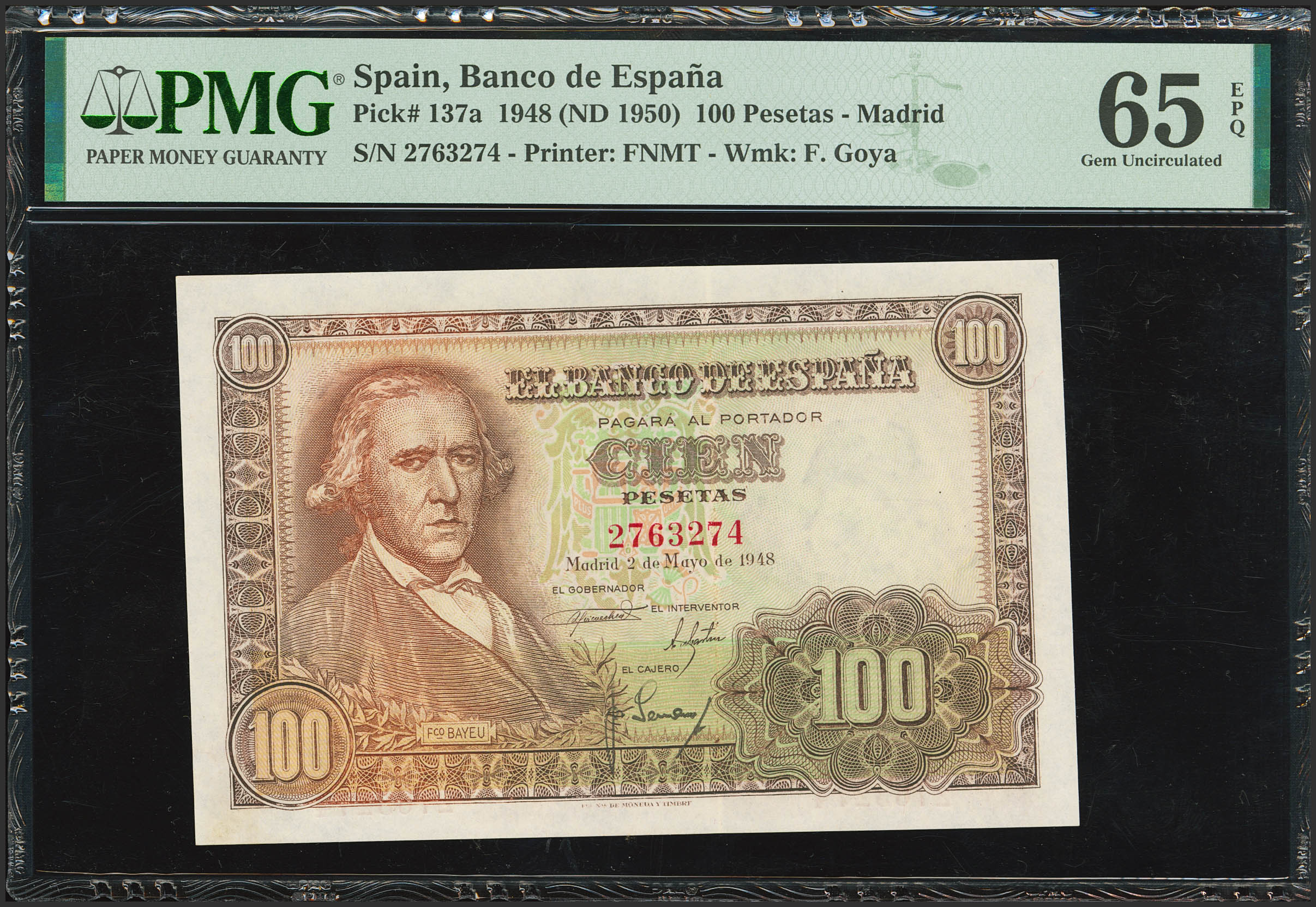 100 Pesetas. 2 de Mayo de 1948. Sin serie. (Edifil 2023: 456, Pick: 137a). Inusual en esta excepcional calidad, apresto original. SC. Encapsulado PMG65EPQ.