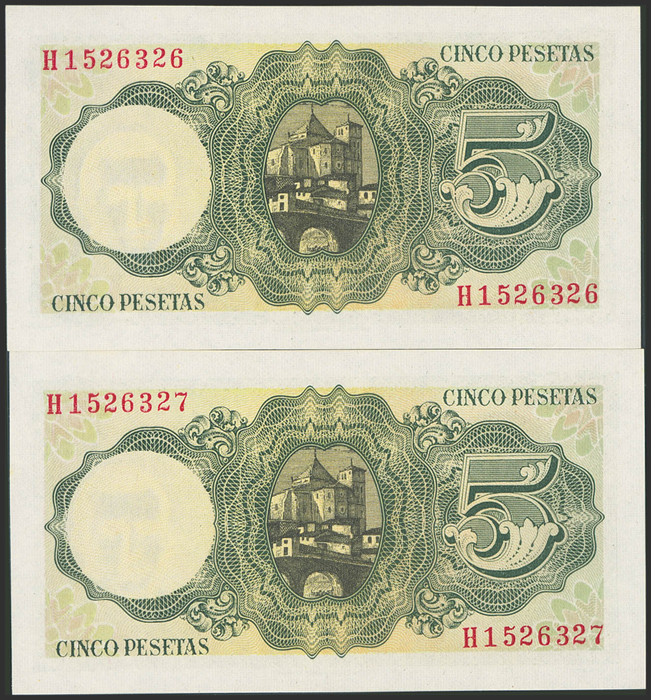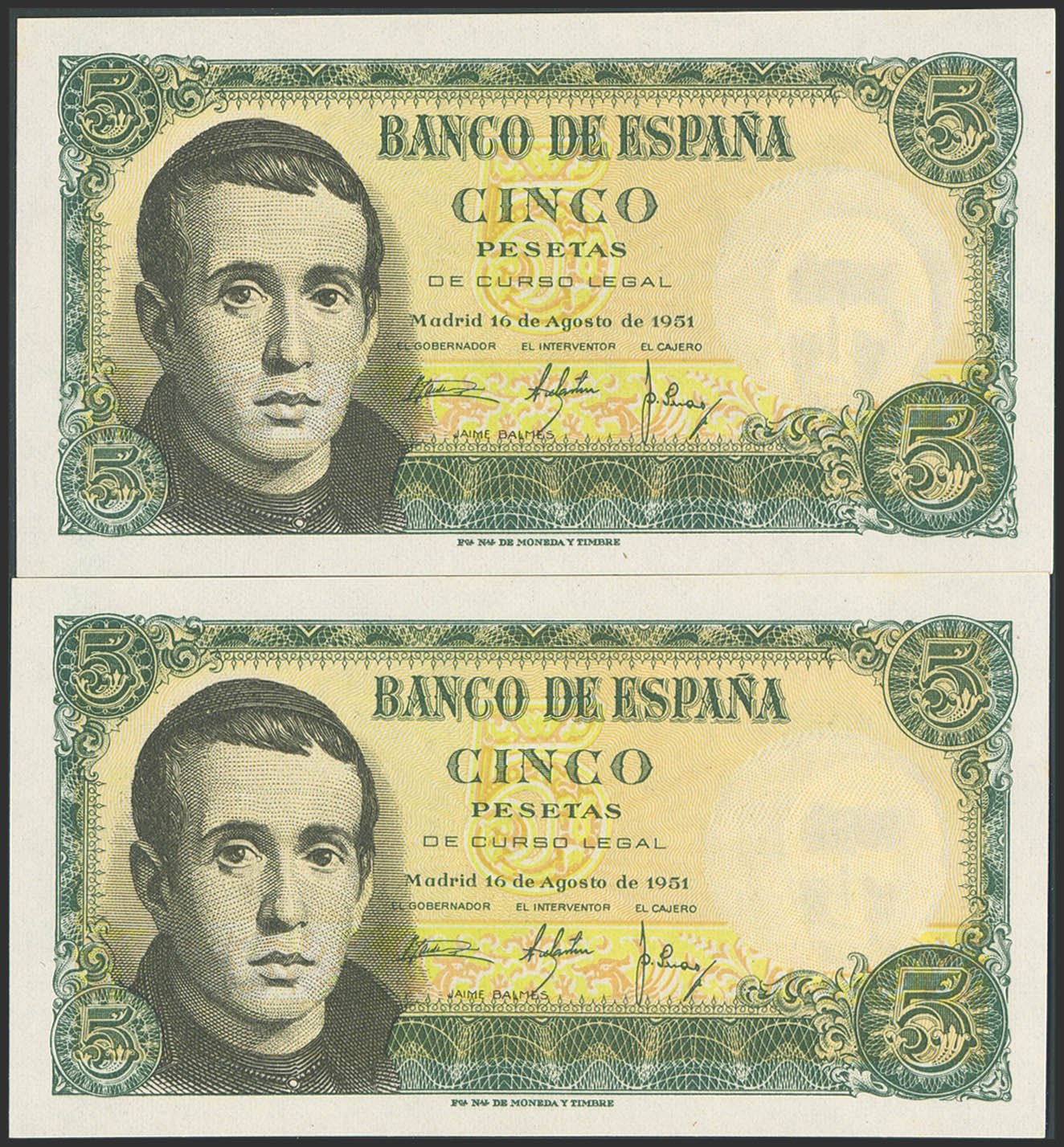 5 Pesetas. 16 de Agosto de 1951. Pareja correlativa. Serie H. (Edifil 2023: 459a). Apresto original. SC.