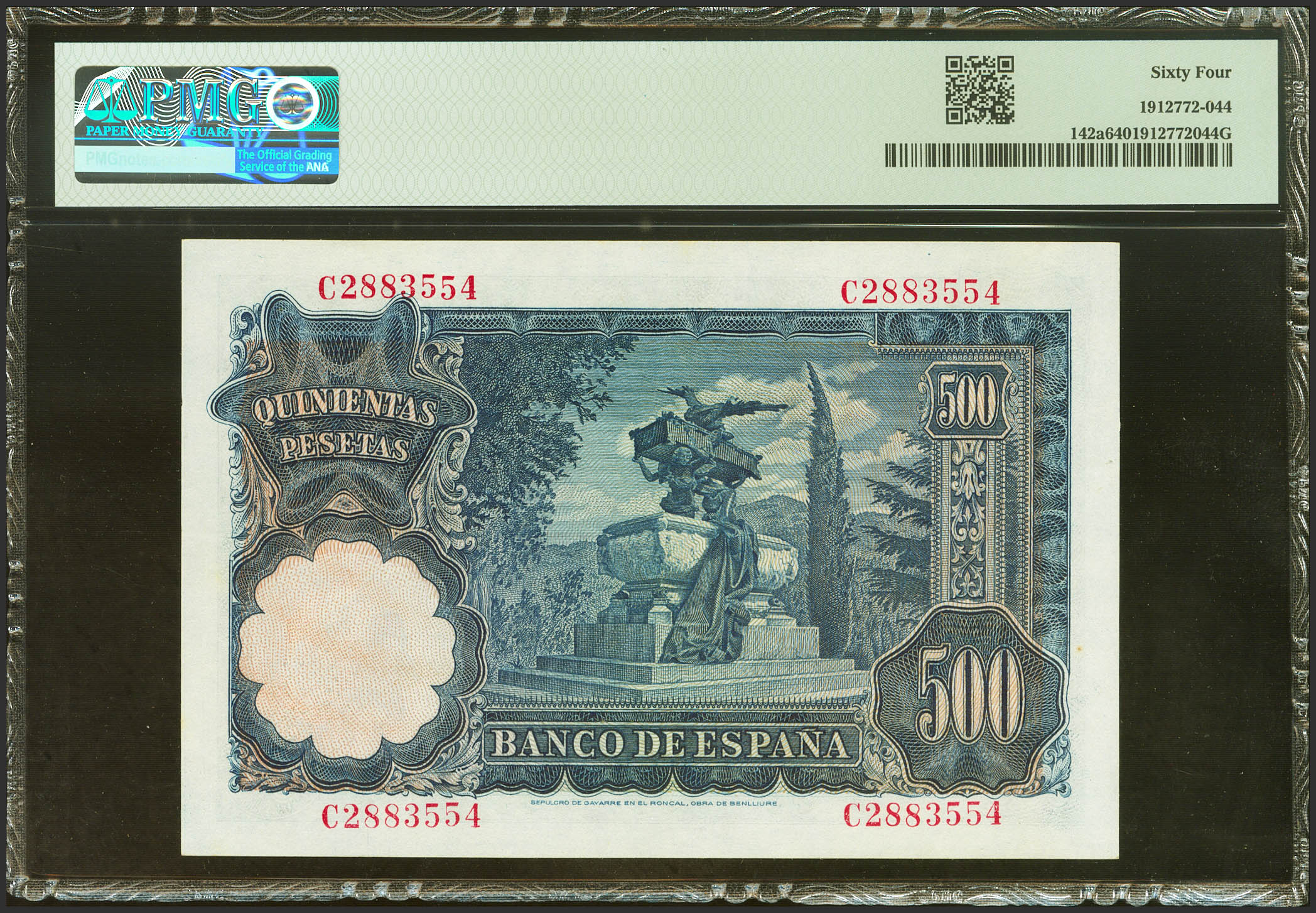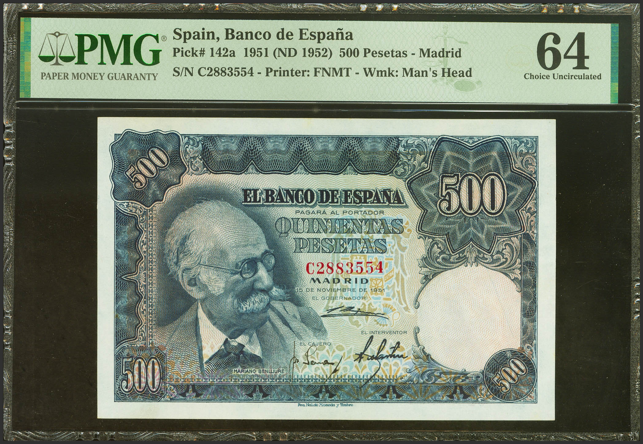 500 Pesetas. 15 de Noviembre de 1951. Serie C. (Edifil 2021: 460a, Pick: 142a). SC. Encapsulado PMG64.
