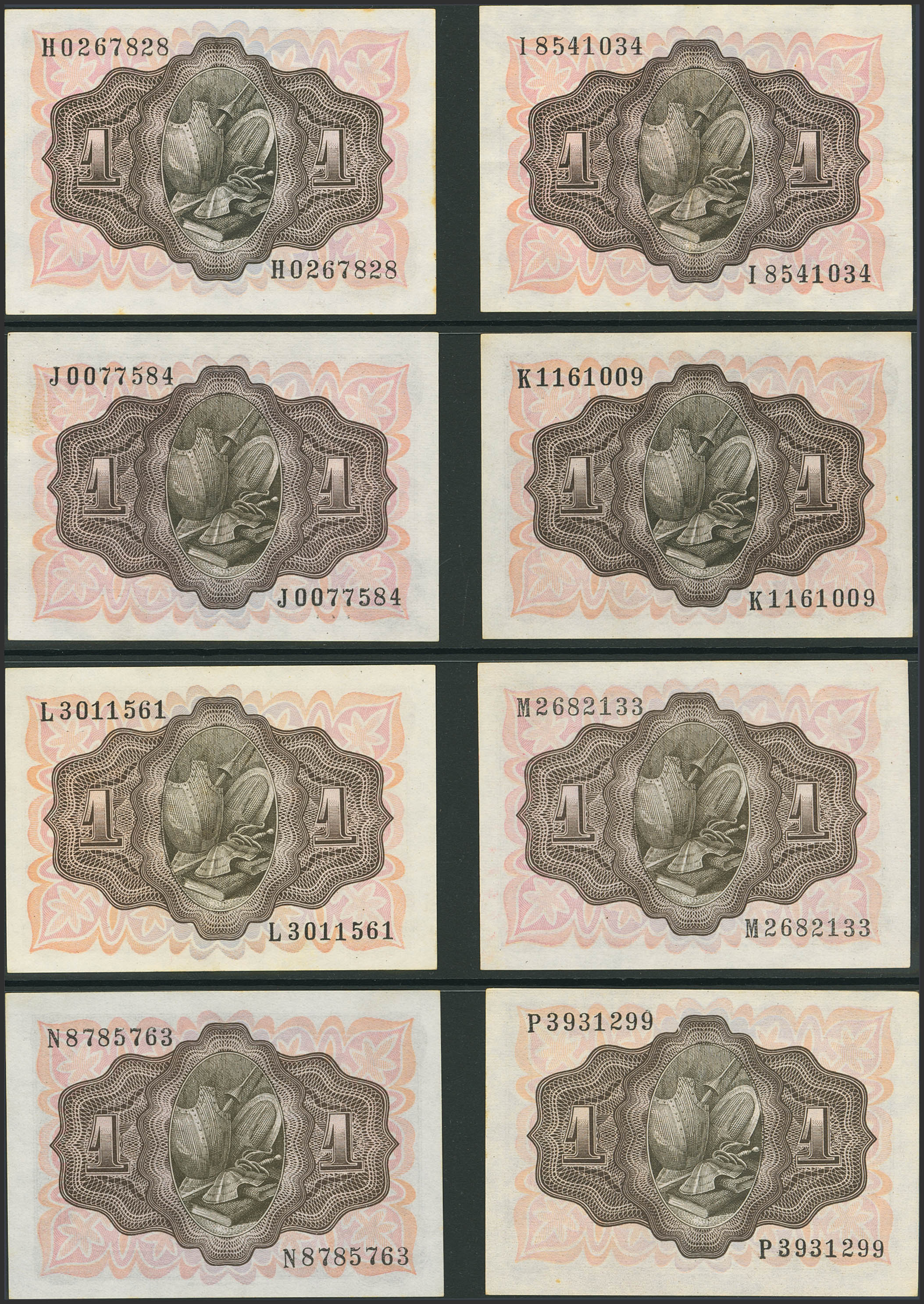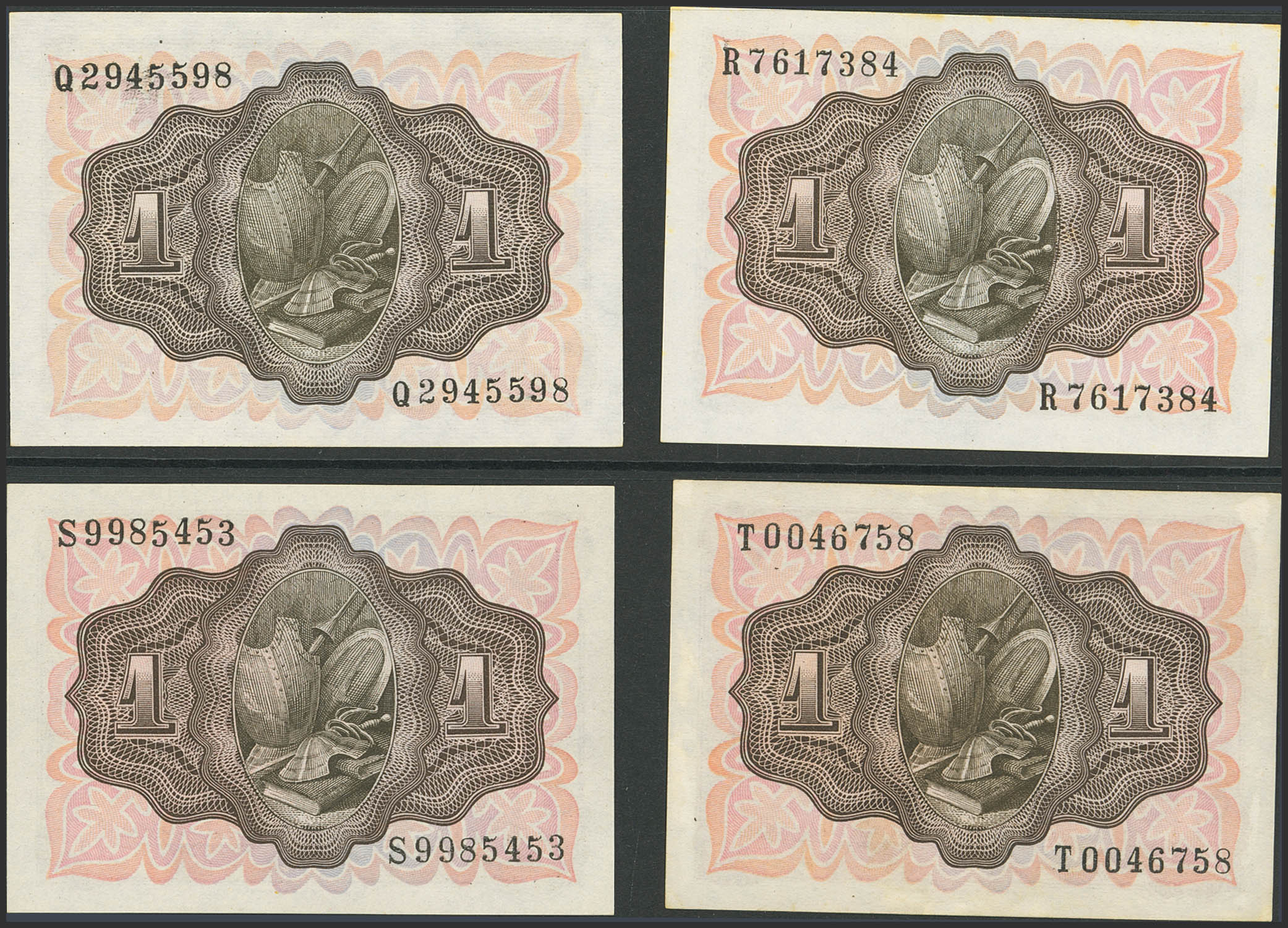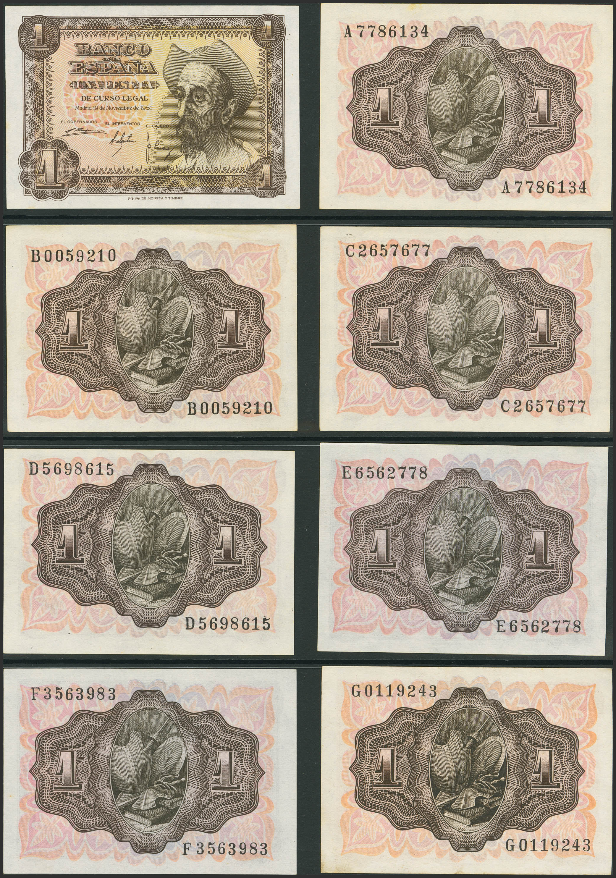 Conjunto de 20 billetes de 1 Peseta, emitidos el 19 de Noviembre de 1951, sin serie y todas las demás series A, B, C, D , E, F, G, H, I, J, K, L, M, N, P, Q, R, S y T. (Edifil 2023: 461, 461a, 461b). Muy inusual conjunto que incluye todas las diferentes series emitidas incluyendo la rarísima serie T (la serie T en conservación EBC). SC/MBC+