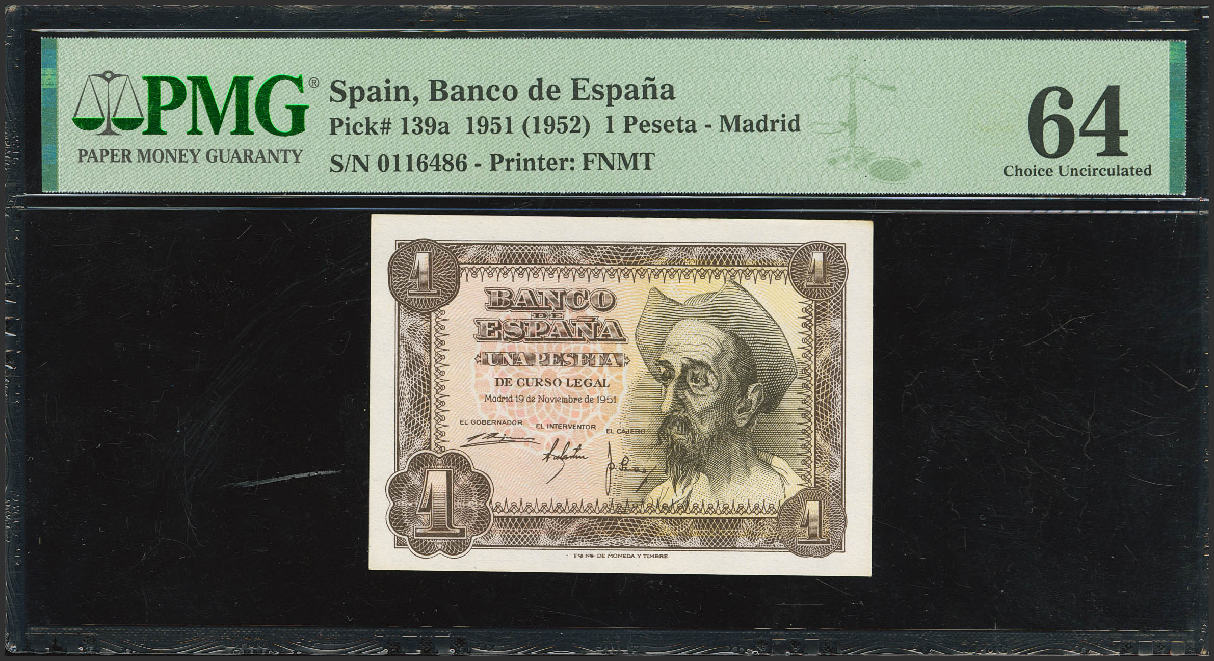 1 Peseta. 19 de Noviembre de 1951. Sin serie. (Edifil 2021: 461, Pick: 139a). SC. Encapsulado PMG64.