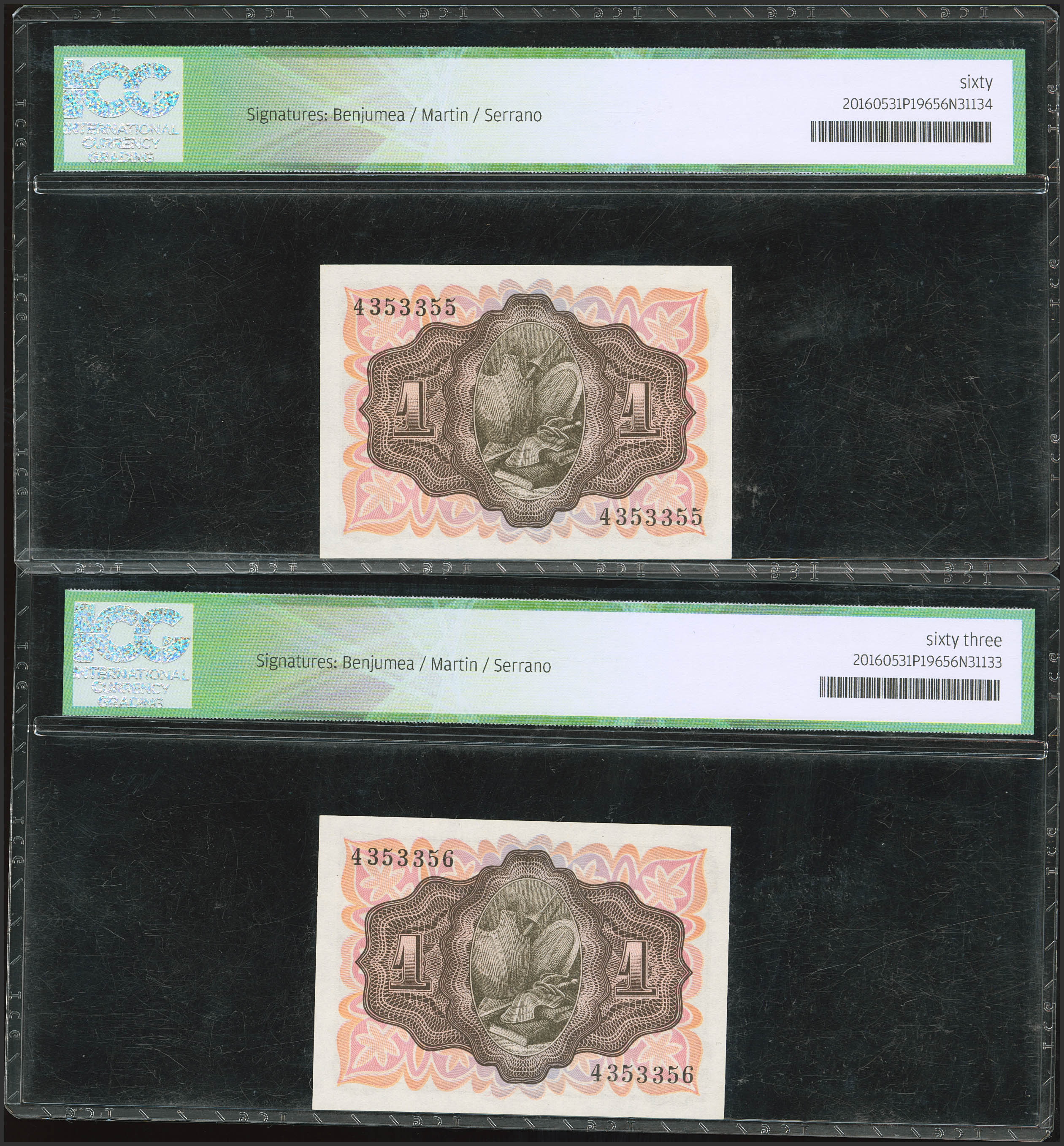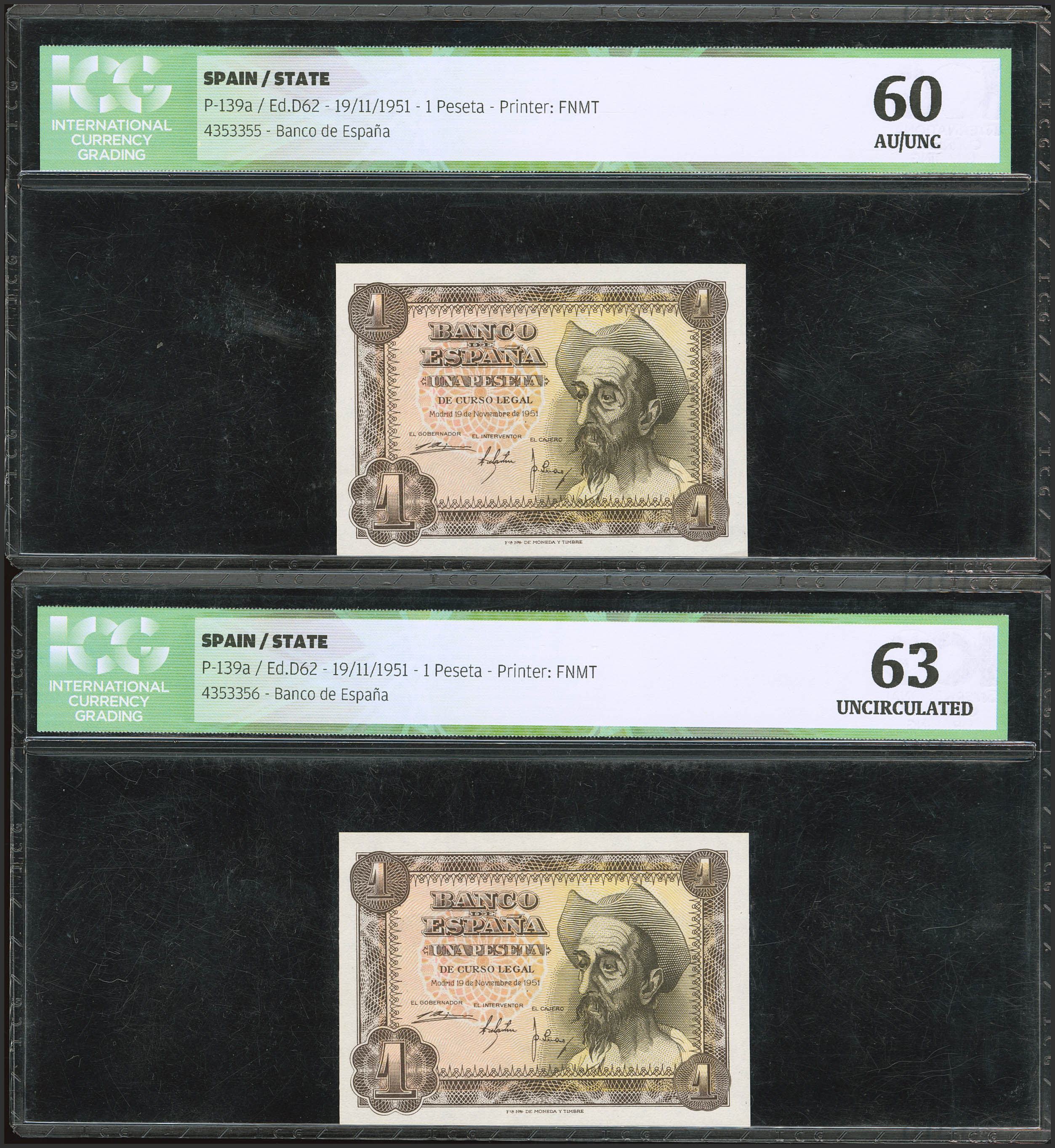 1 Pesetas. 19 de Noviembre de 1951. Pareja correlativa. Sin serie. (Edifil 2023: 461, Pick: 139a). SC. Encapsulado ICG63/60.