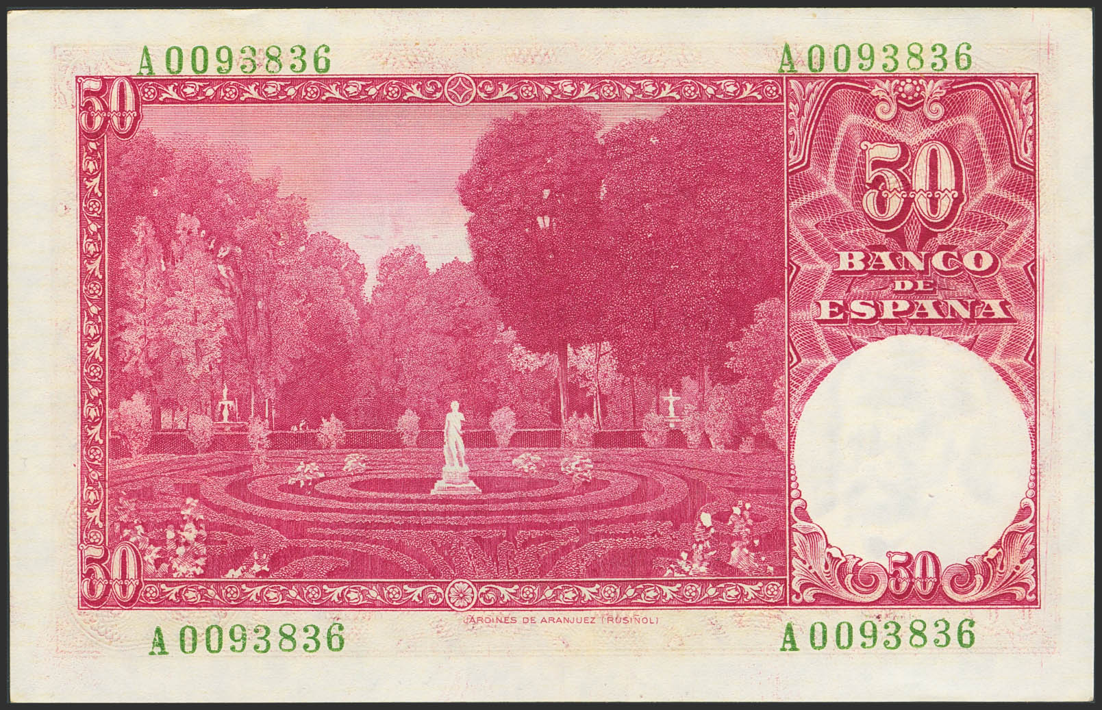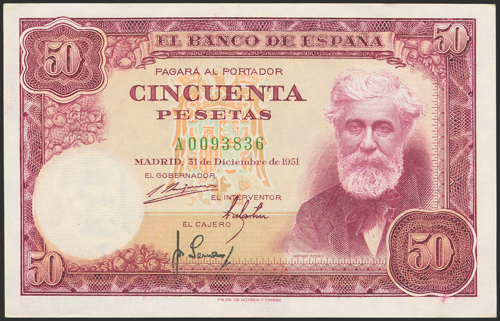 50 Pesetas. 31 de Diciembre de 1951. Serie A. (Edifil 2023: 462a). Tonalizado, apresto original. SC-.