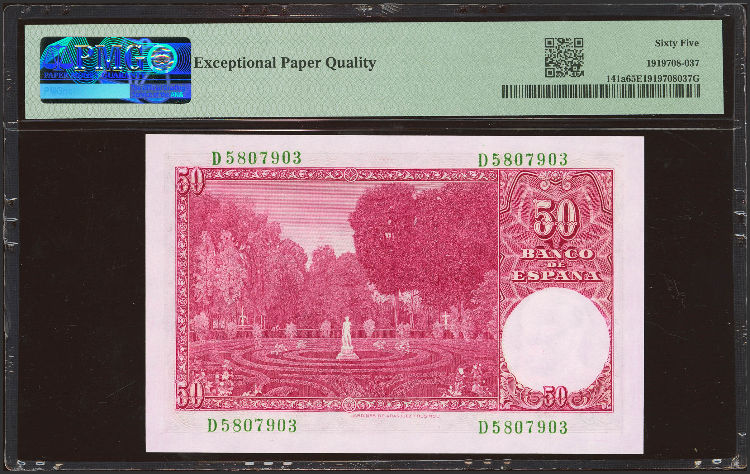 50 Pesetas. 31 de Diciembre de 1951. Serie D y a falta de la firma del cajero. (Edifil 2021: 462c, Pick: 141a). Rarísimo y más en esta excepcional calidad, apresto original. SC. Encapsulado PMG65EPQ