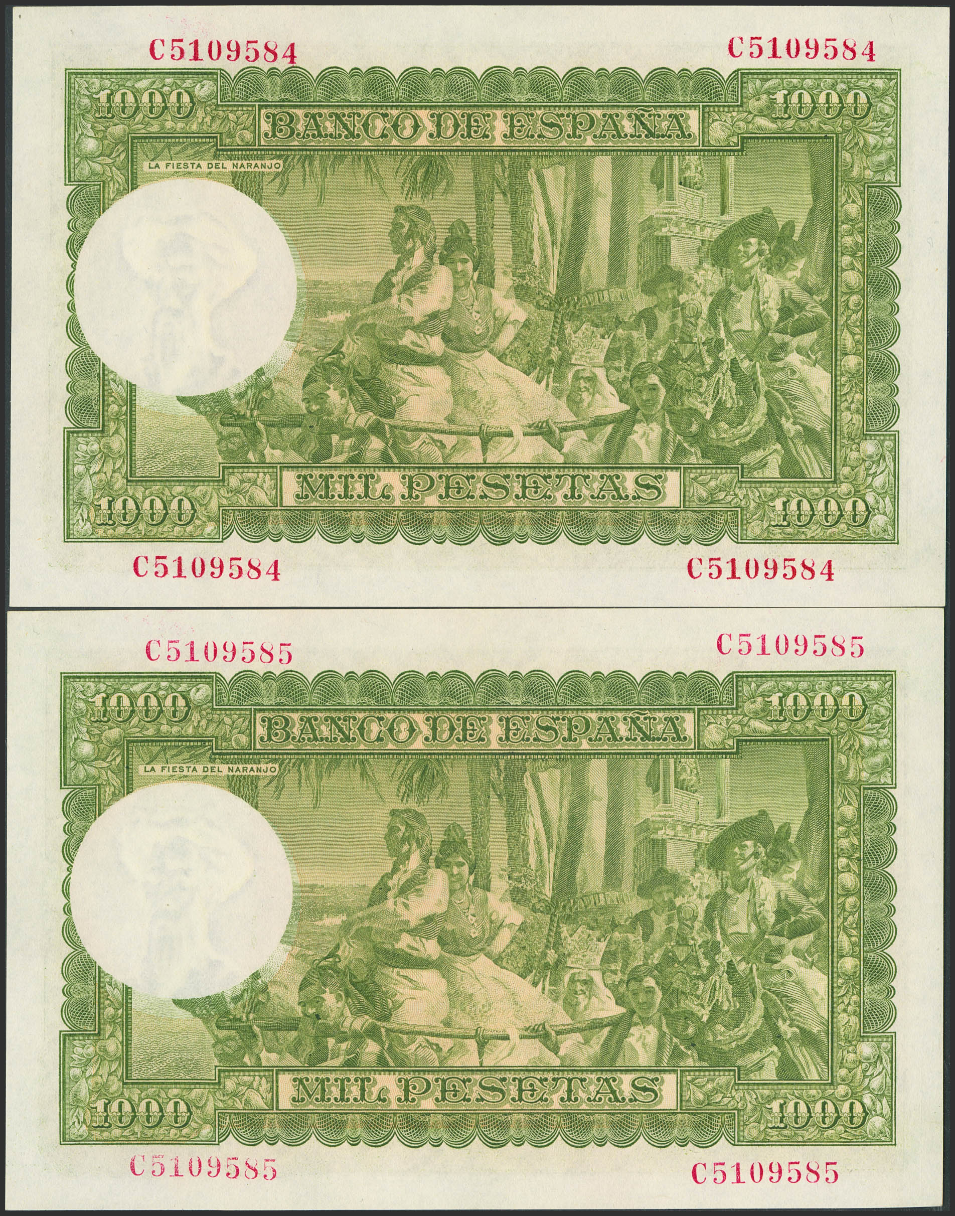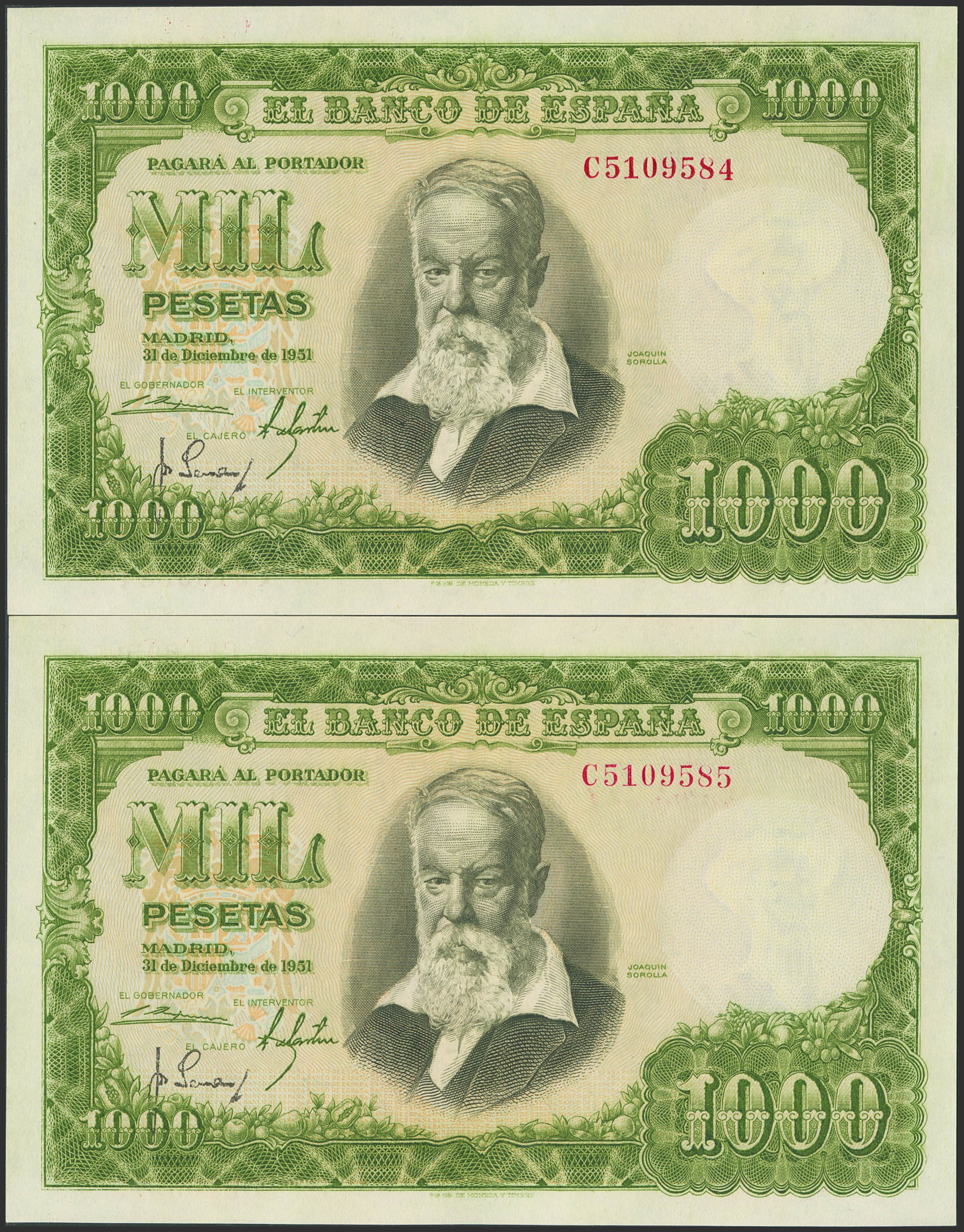 1000 Pesetas. 31 de Diciembre de 1951. Pareja correlativa. Serie C, última serie emitida. (Edifil 2023: 463b). Apresto original. EBC++.