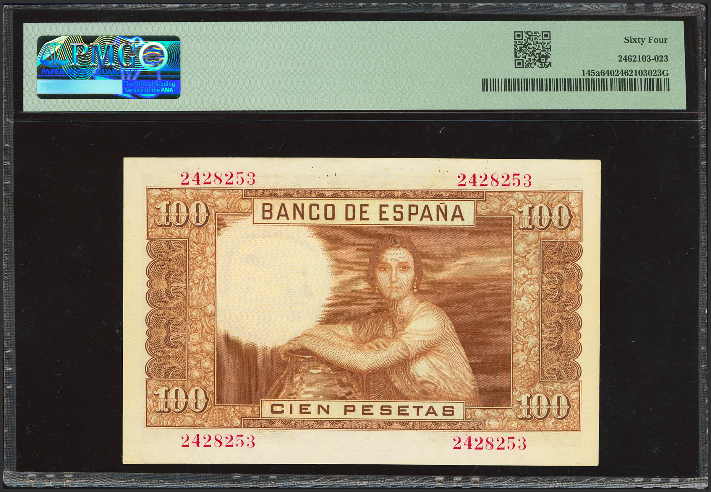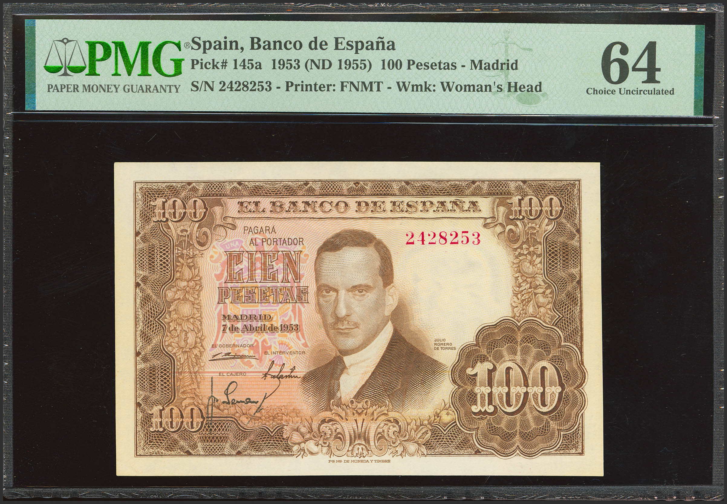 100 Pesetas. 7 de Abril de 1953. Sin serie. (Edifil 2023: 464, Pick: 145a). Inusual. SC. Encapsulado PMG64.