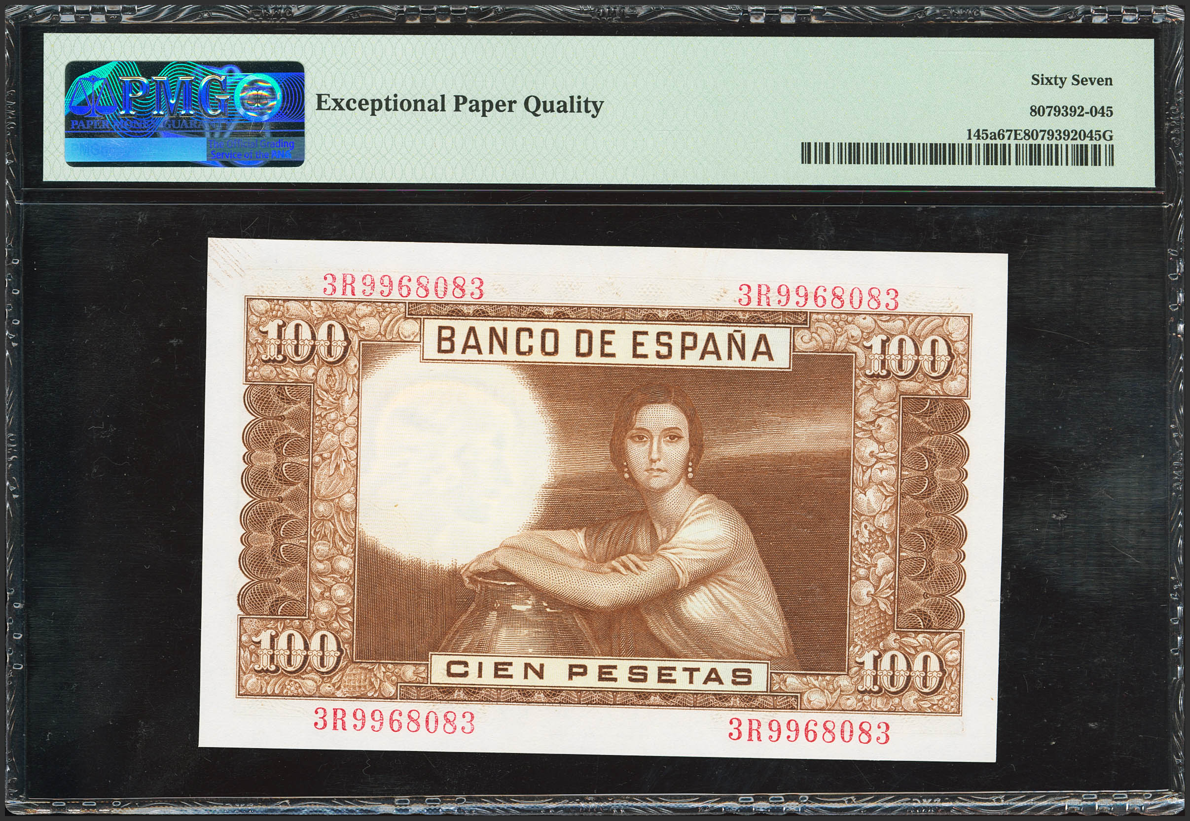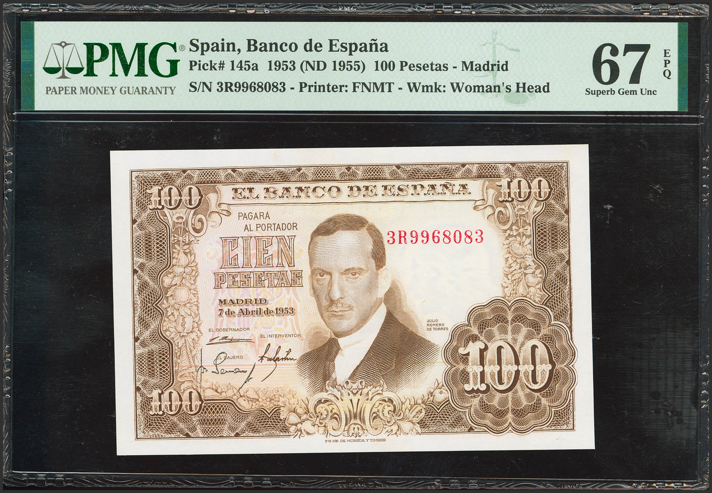 100 Pesetas. 7 de Abril de 1953. Serie 3R. (Edifil 2023: 464c, Pick: 145a). Apresto original. SC. Encapsulado PMG67EPQ.