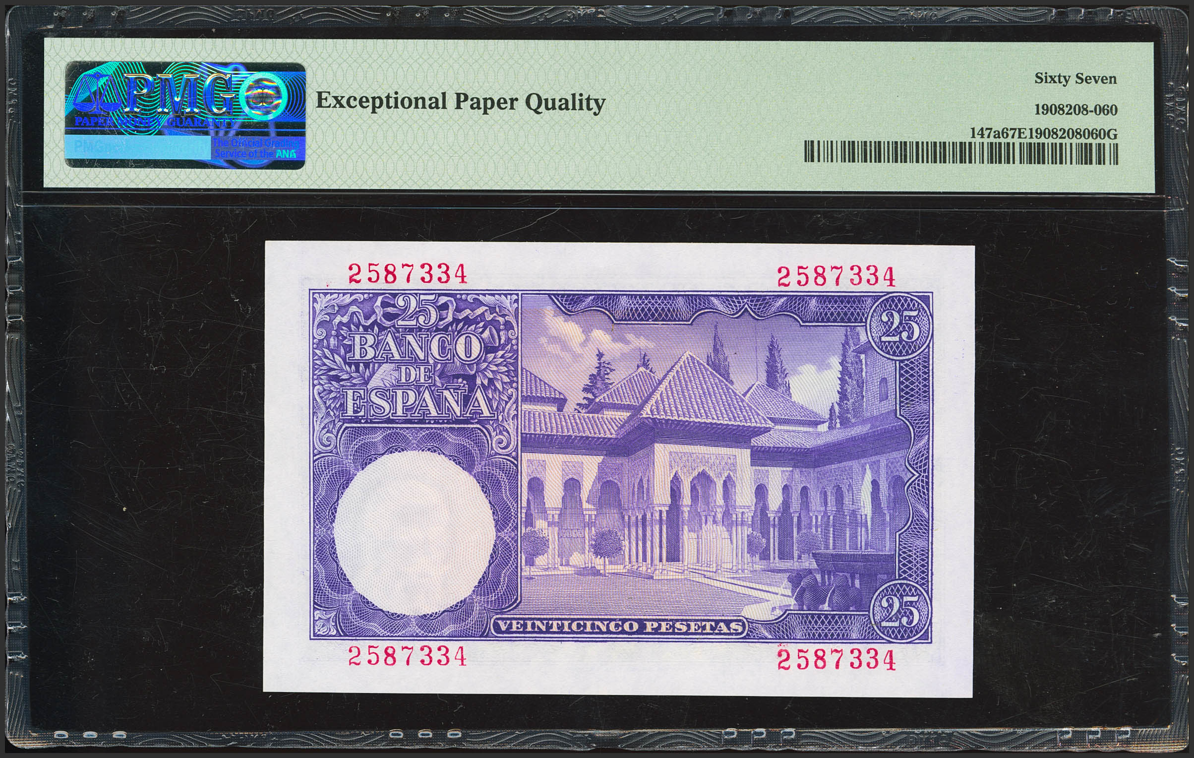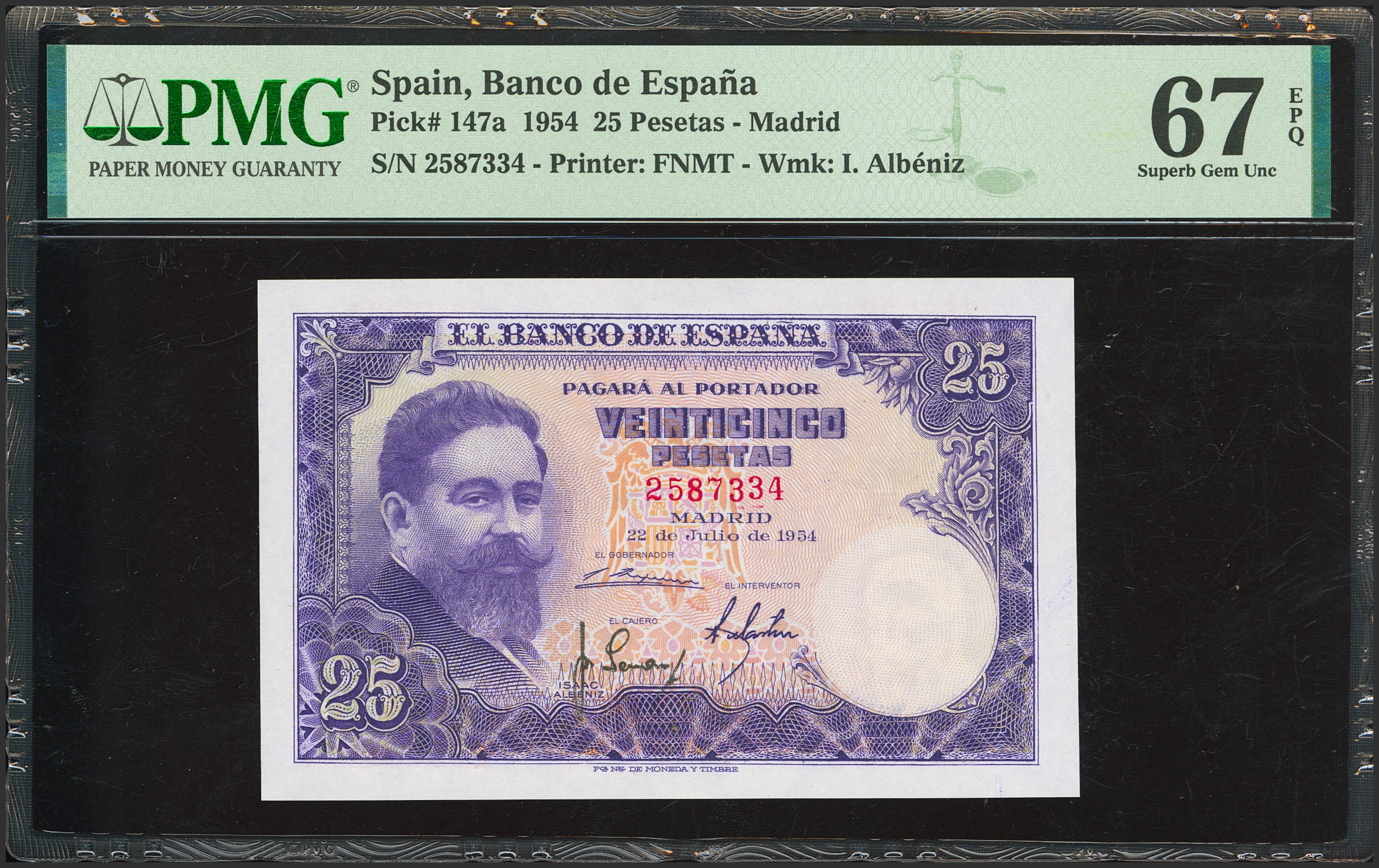 25 Pesetas. 22 de Julio de 1954. Sin serie. (Edifil 2023: 467, Pick: 147a). Rarísimo en esta excepcional calidad, apresto original. SC. Encapsulado PMG67EPQ.