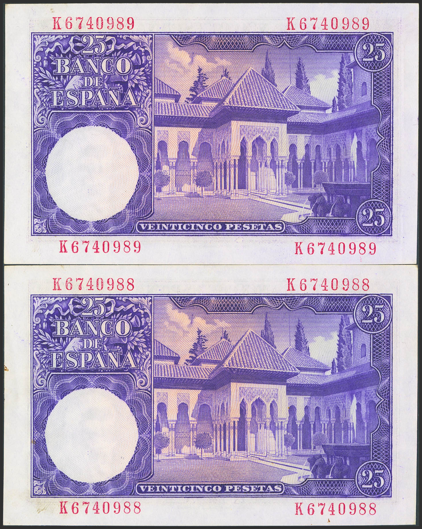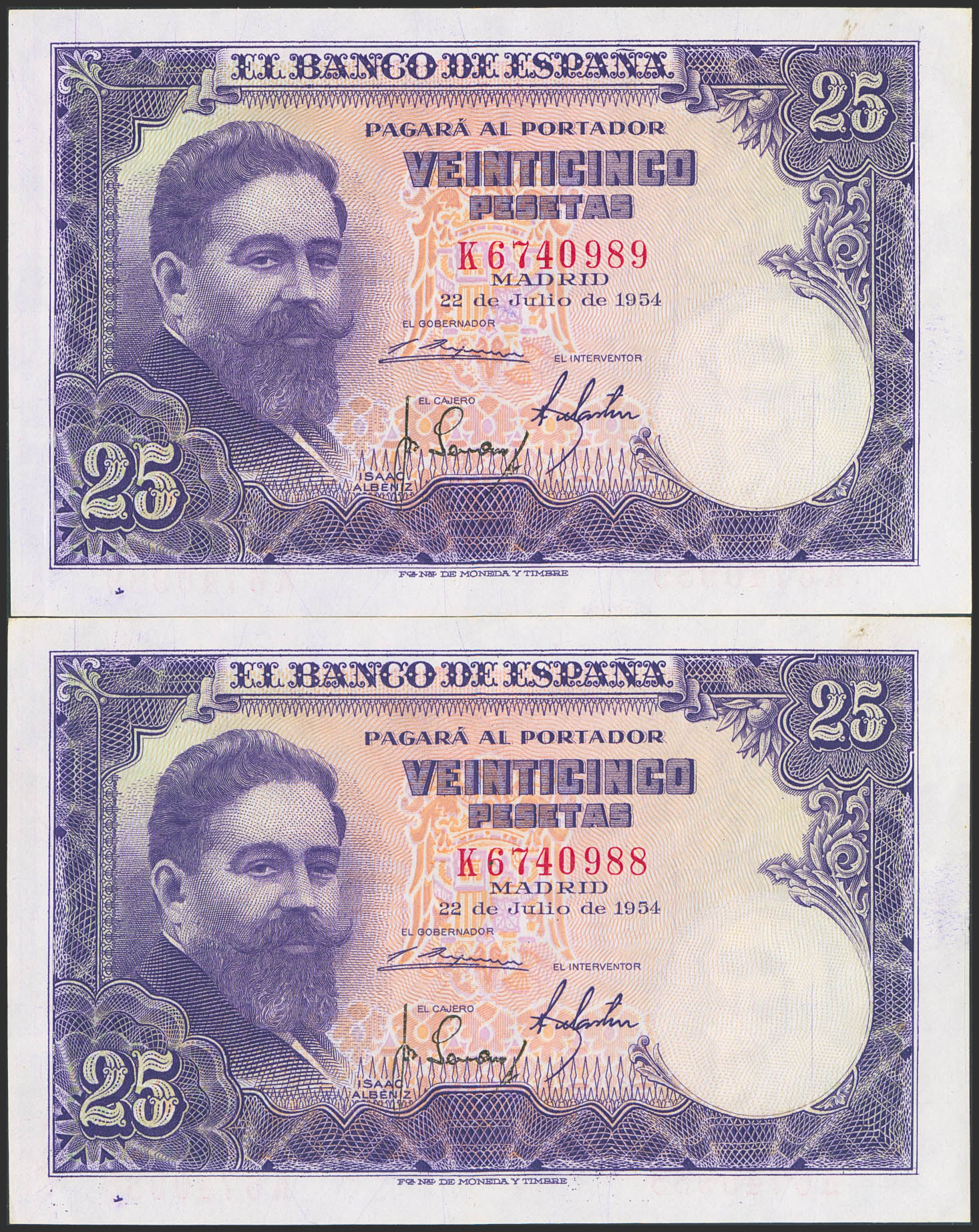 25 Pesetas. 22 de Julio de 1954. Pareja correlativa. Serie K. (Edifil 2023: 467a). Apresto original. SC-.