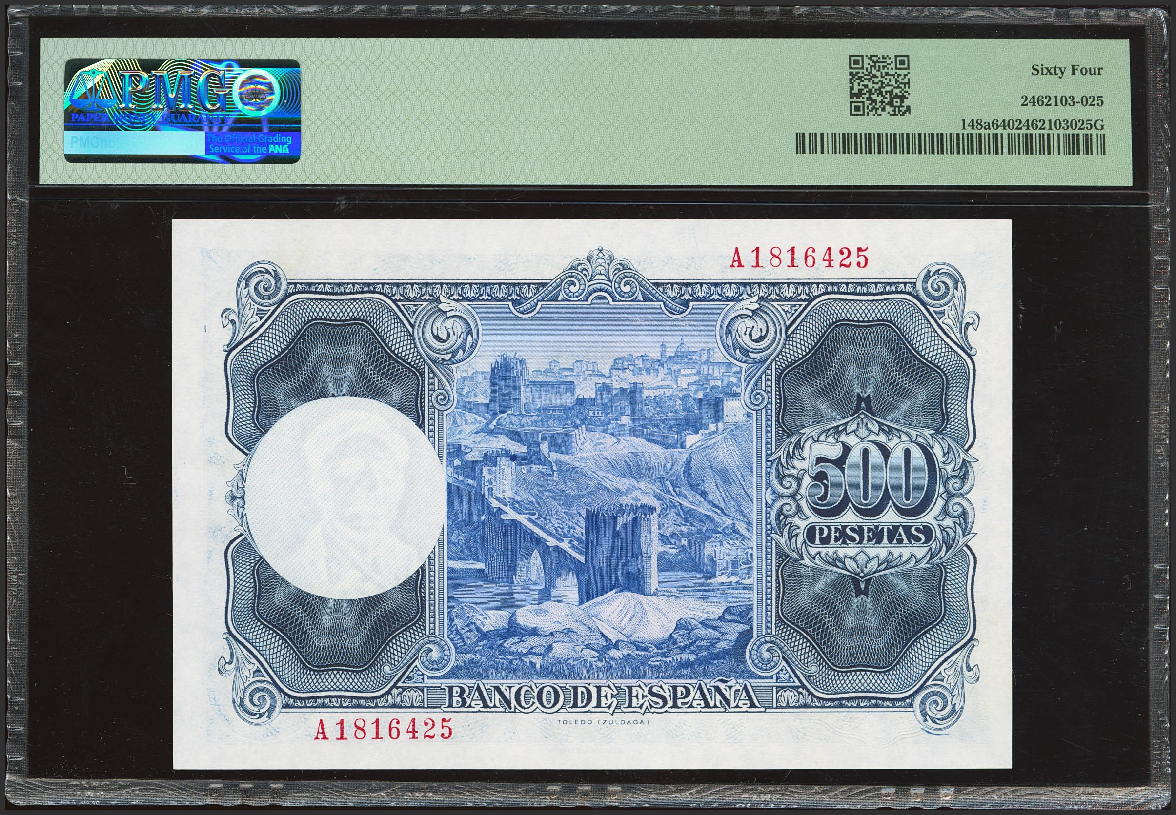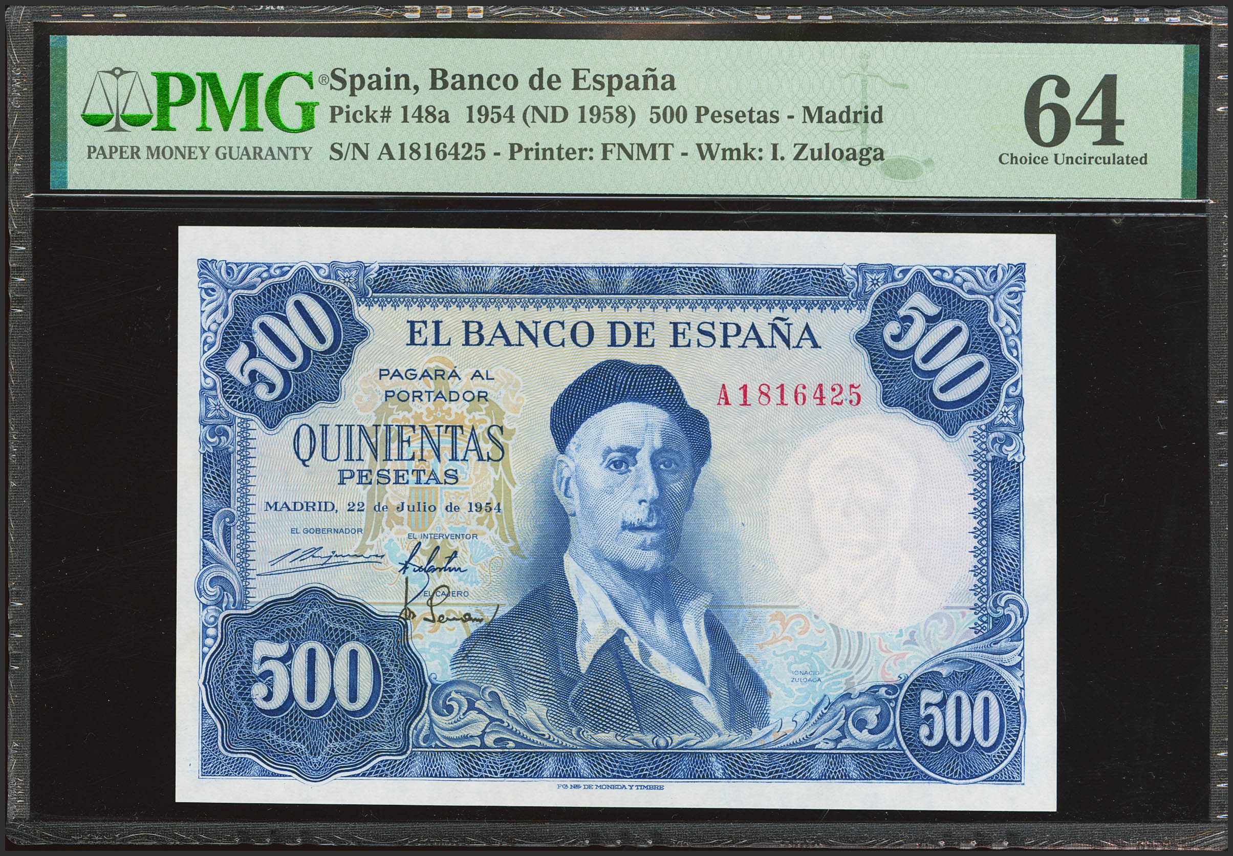 500 Pesetas. 22 de Julio de 1954. Serie A. (Edifil 2023: 468a, Pick: 148a). Raro en esta calidad. SC. Encapsulado PMG64.