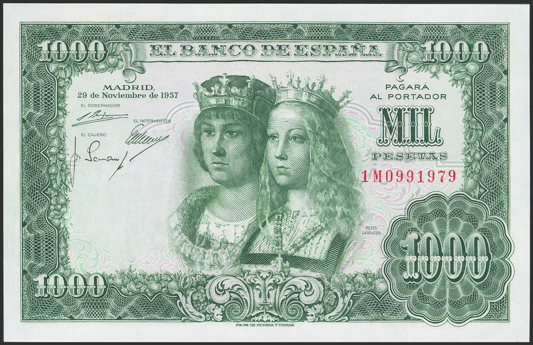 1000 Pesetas. 29 de Noviembre de 1957. Serie 1M. (Edifil 2023: 469b). Conserva parte del apresto original. EBC.