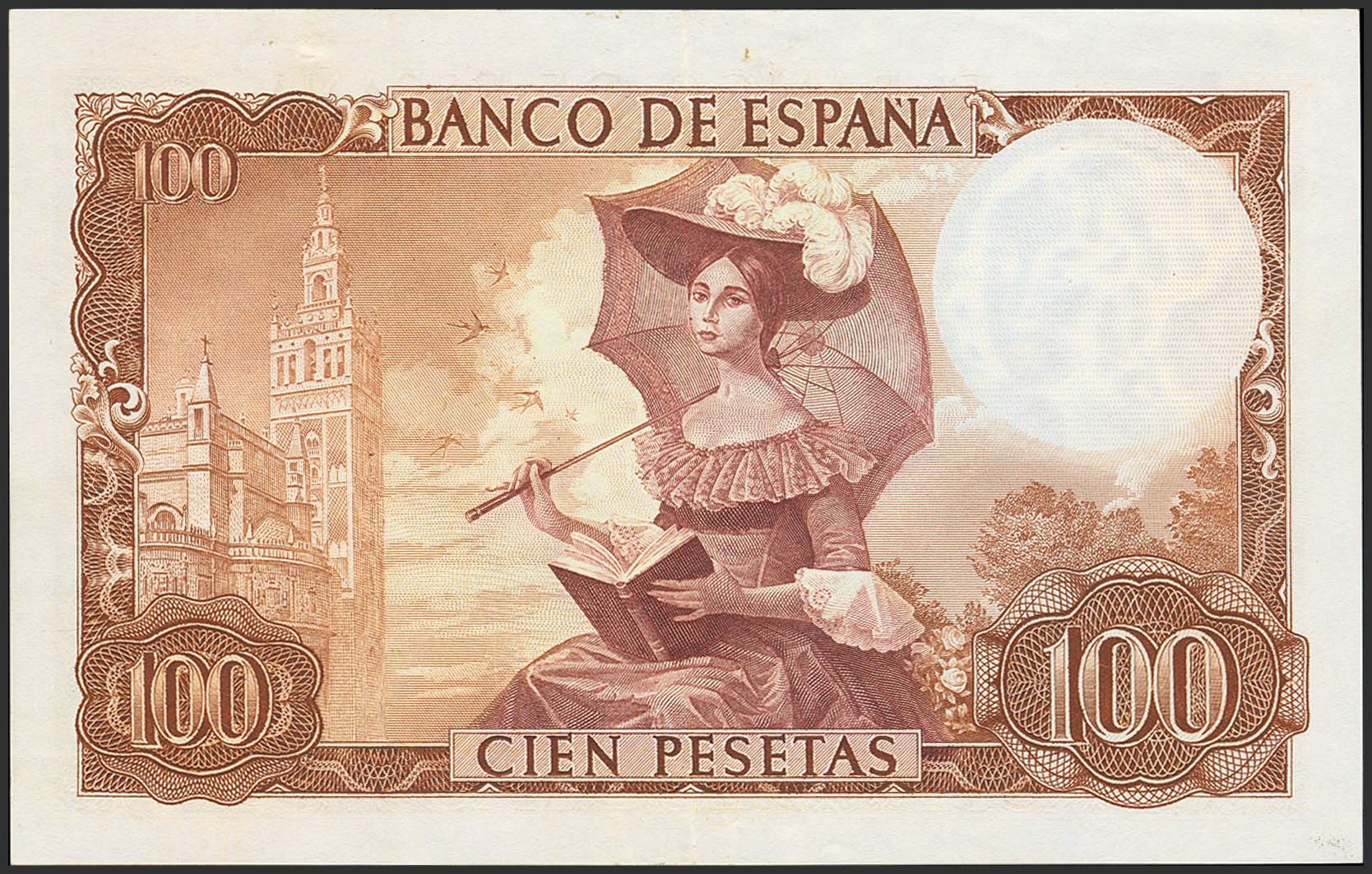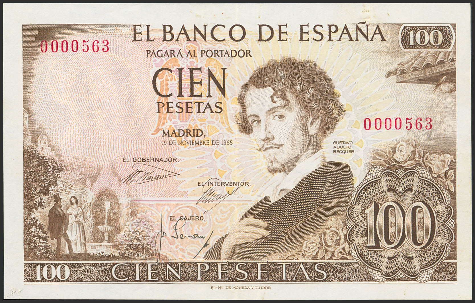 100 Pesetas. 19 de Noviembre de 1965. Sin serie y numeración bajísima (Nº0000563). (Edifil 2023: 470). Conserva parte del apresto original. MBC+.