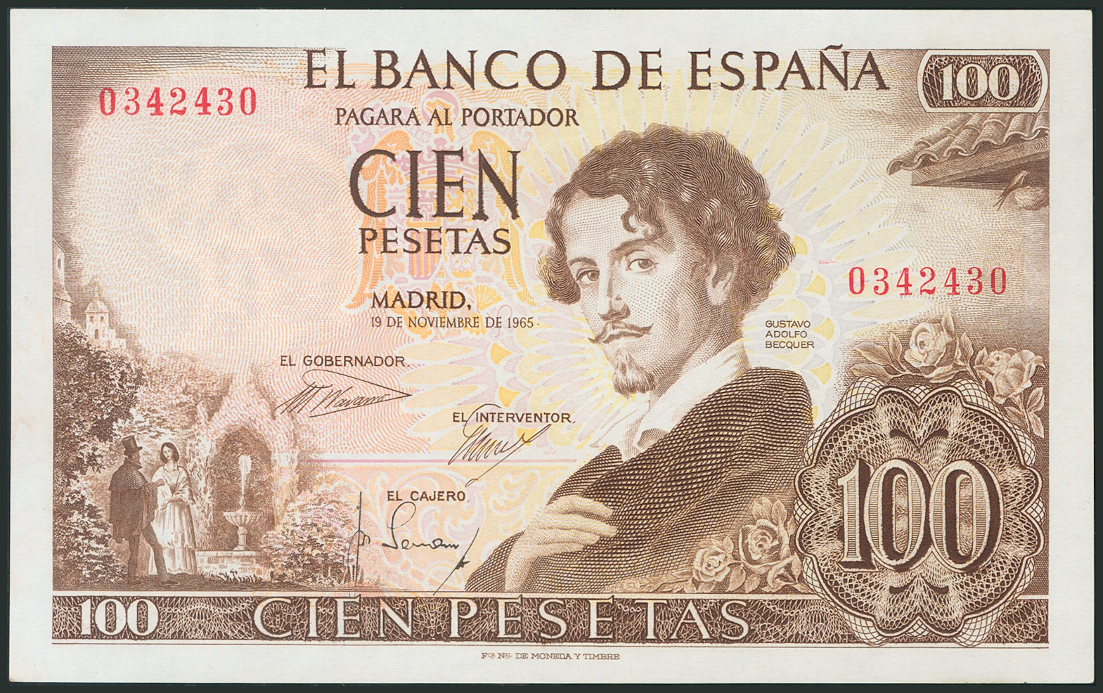 100 Pesetas. 19 de Noviembre de 1965. Sin serie y numeración capicúa 0342430. (Edifil 2017: 470). SC-.