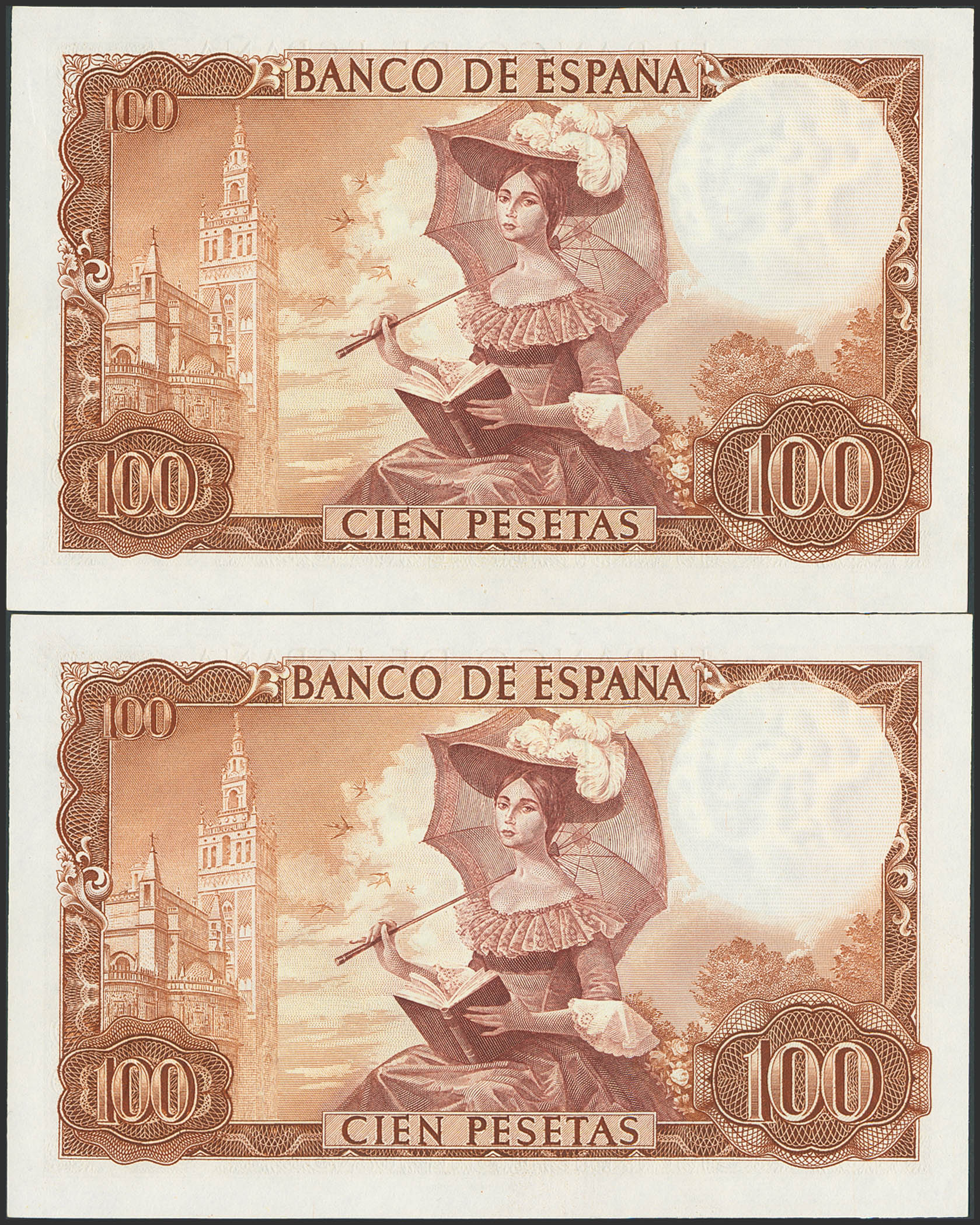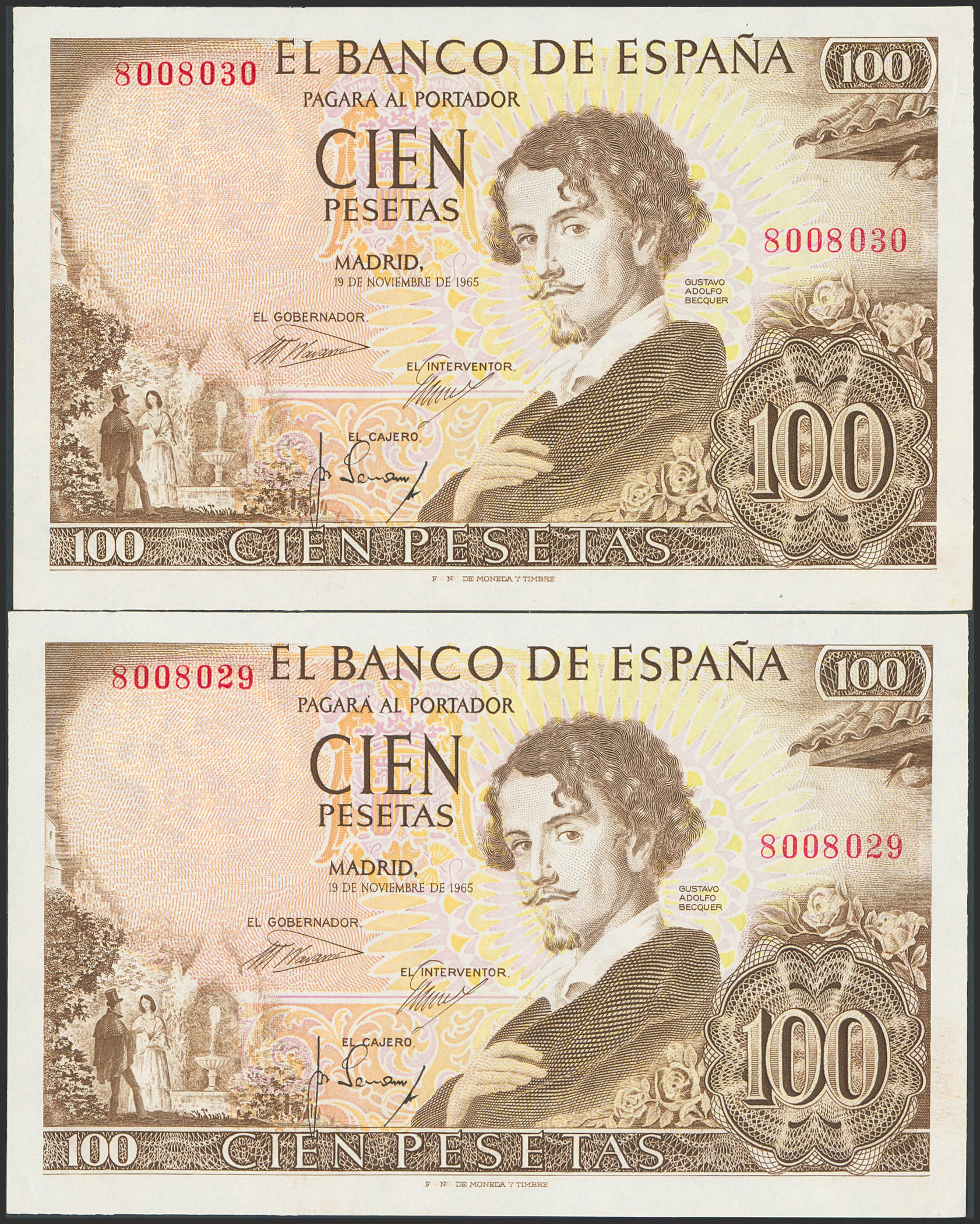 100 Pesetas. 19 de Noviembre de 1965. Pareja correlativa. Sin serie. (Edifil 2023: 470). Apresto original. SC-.