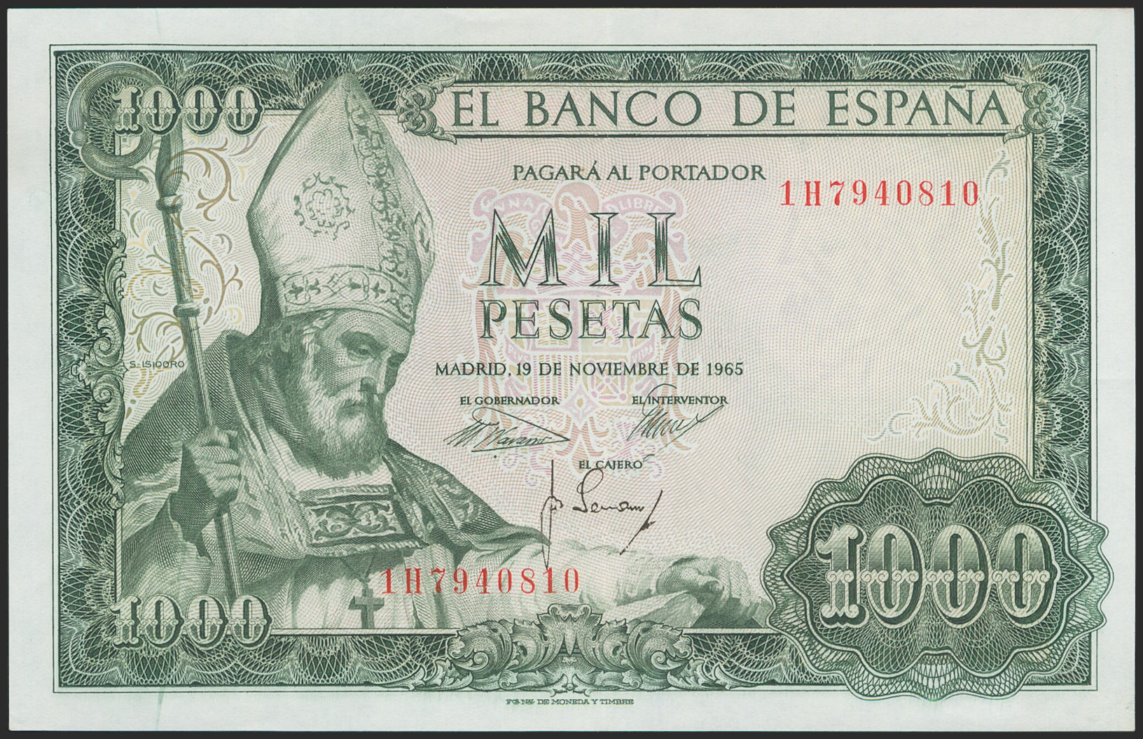 1000 Pesetas. 19 de Noviembre de 1965. Serie 1H. (Edifil 2021: 471b). Apresto original. SC.