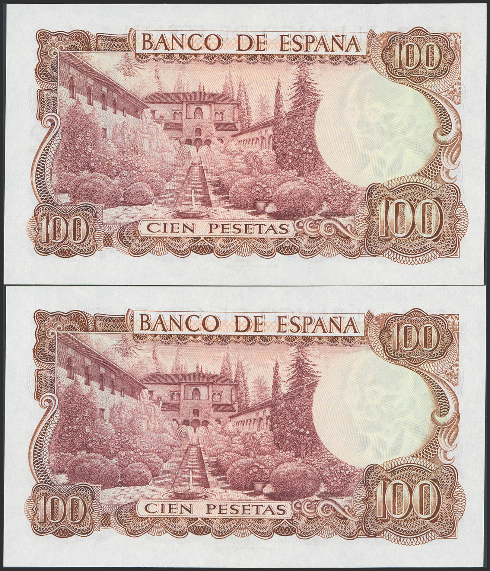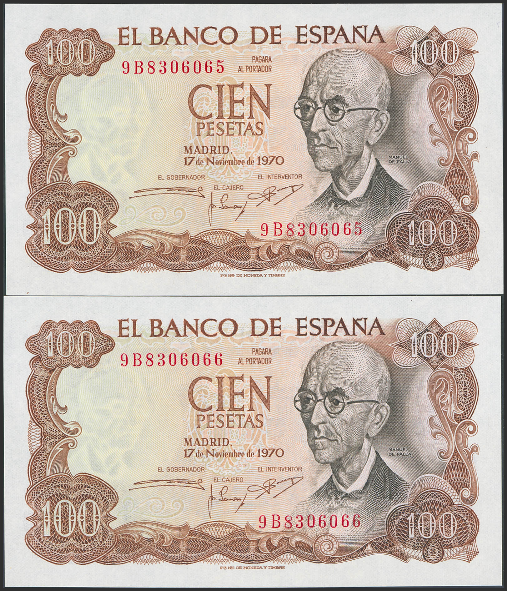 100 Pesetas. 17 de Noviembre de 1970. Pareja correlativa. Serie especial 9B. (Edifil 2023: 472d). Apresto original. SC.