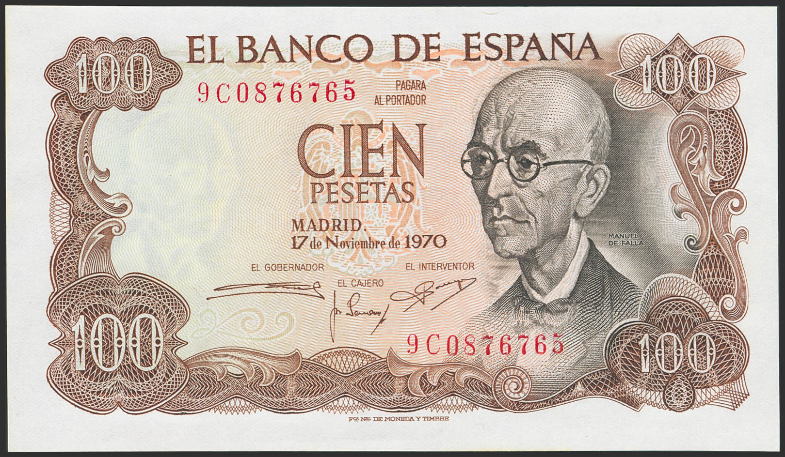 100 Pesetas. 17 de Noviembre de 1970. Serie especial 9C. (Edifil 2023: 472d). Apresto original. SC.