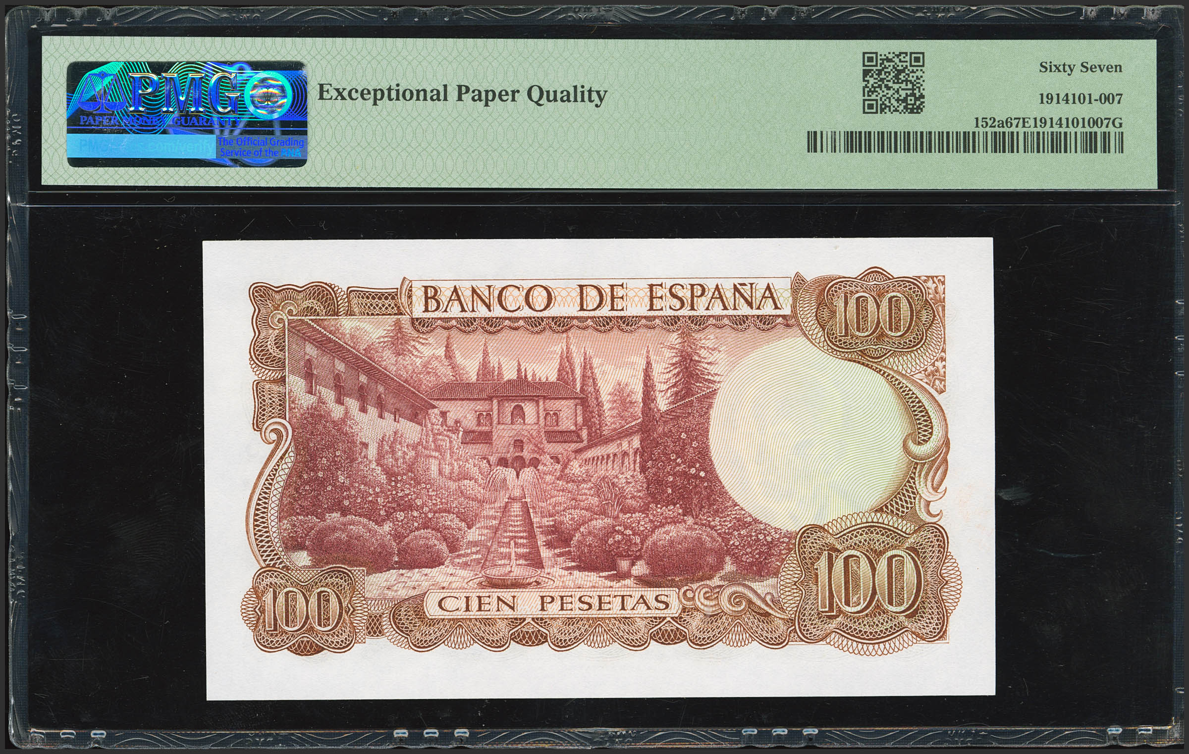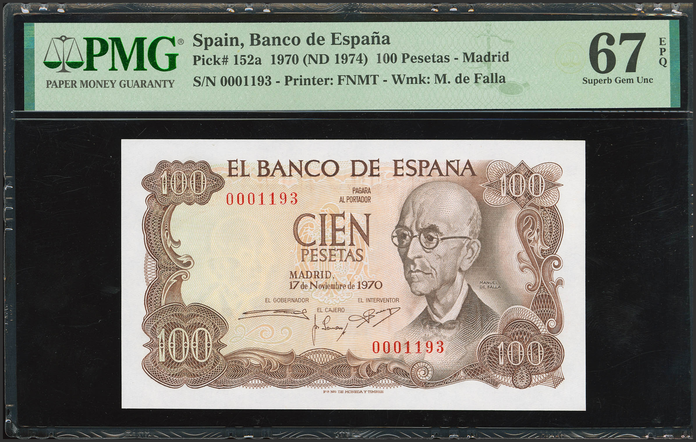 100 Pesetas. 17 de Noviembre de 1970. Sin serie y numeración bajísima. (Edifil 2023: 472, Pick: 152a). Raro en esta excepcional calidad, apresto original. SC. Encapsulado PMG67EPQ.