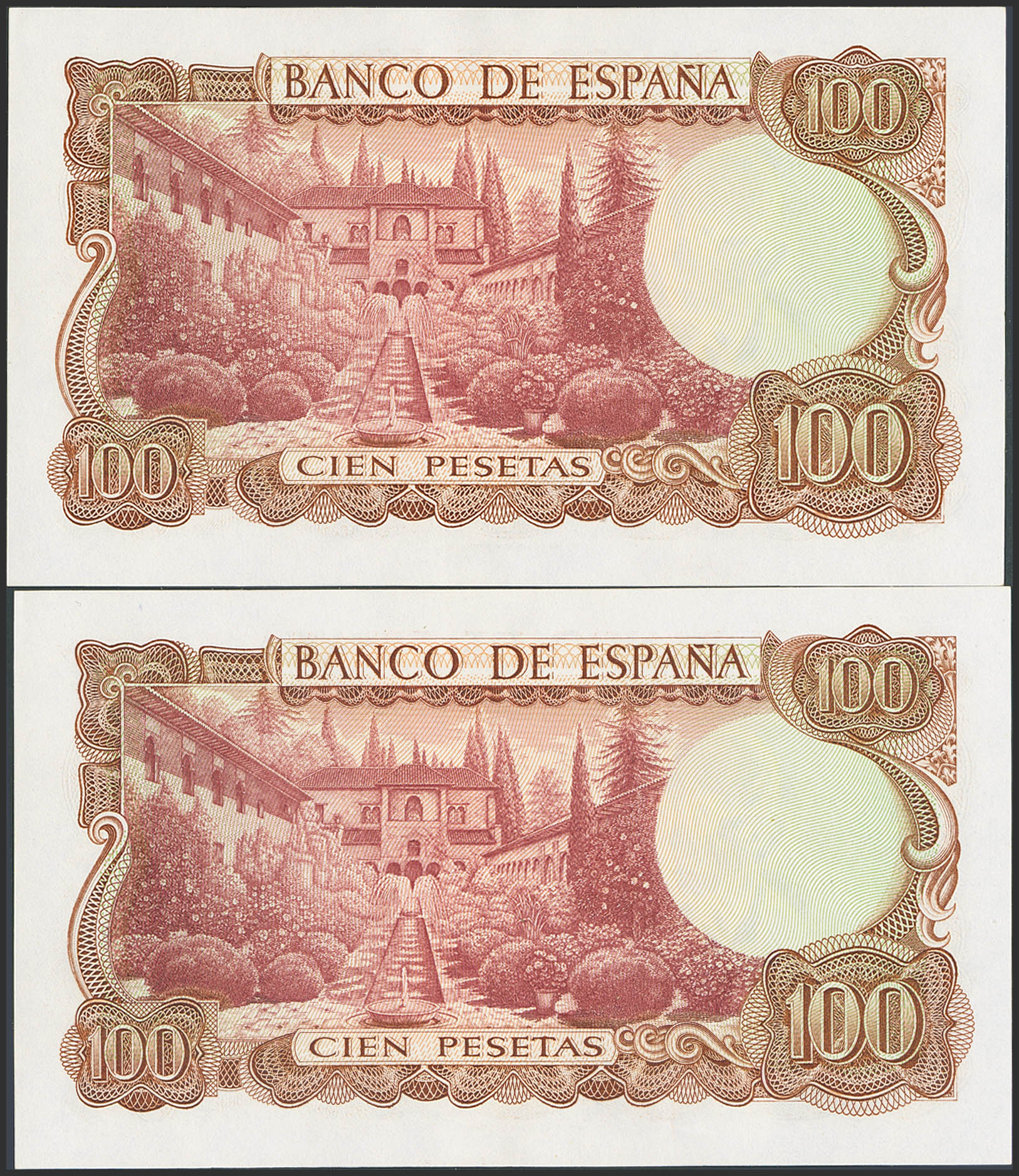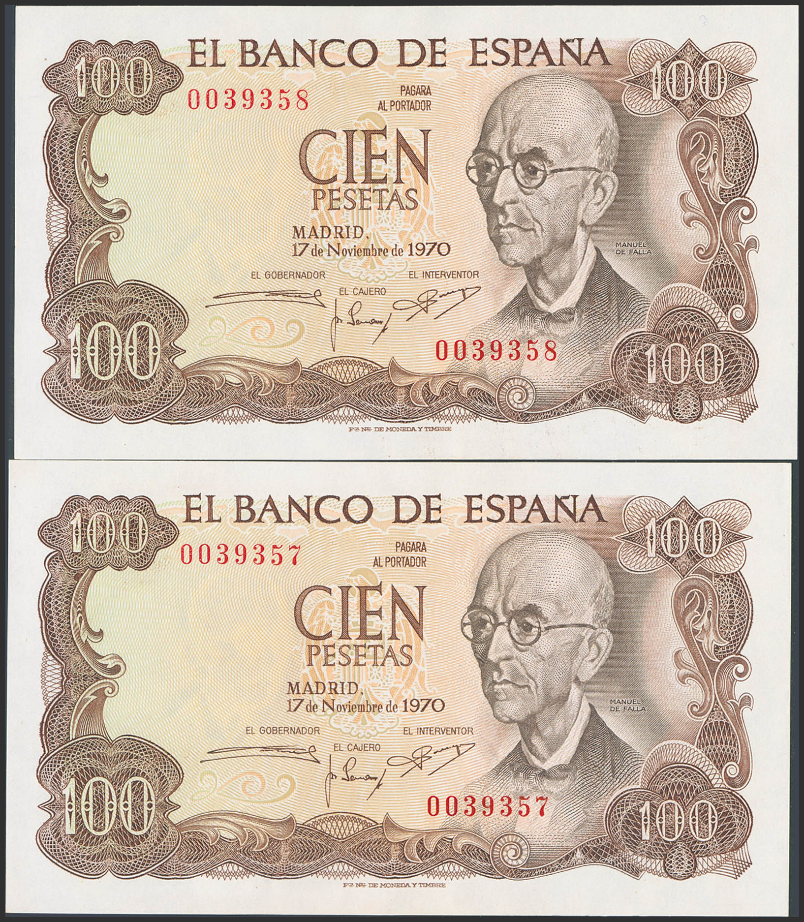 100 Pesetas. 17 de Noviembre de 1970. Pareja correlativa. Sin serie y numeración baja. (Edifil 2023: 472). Apresto original. SC-.