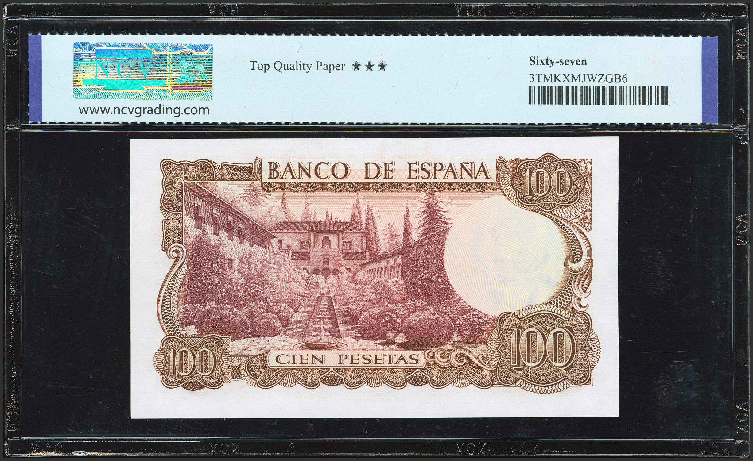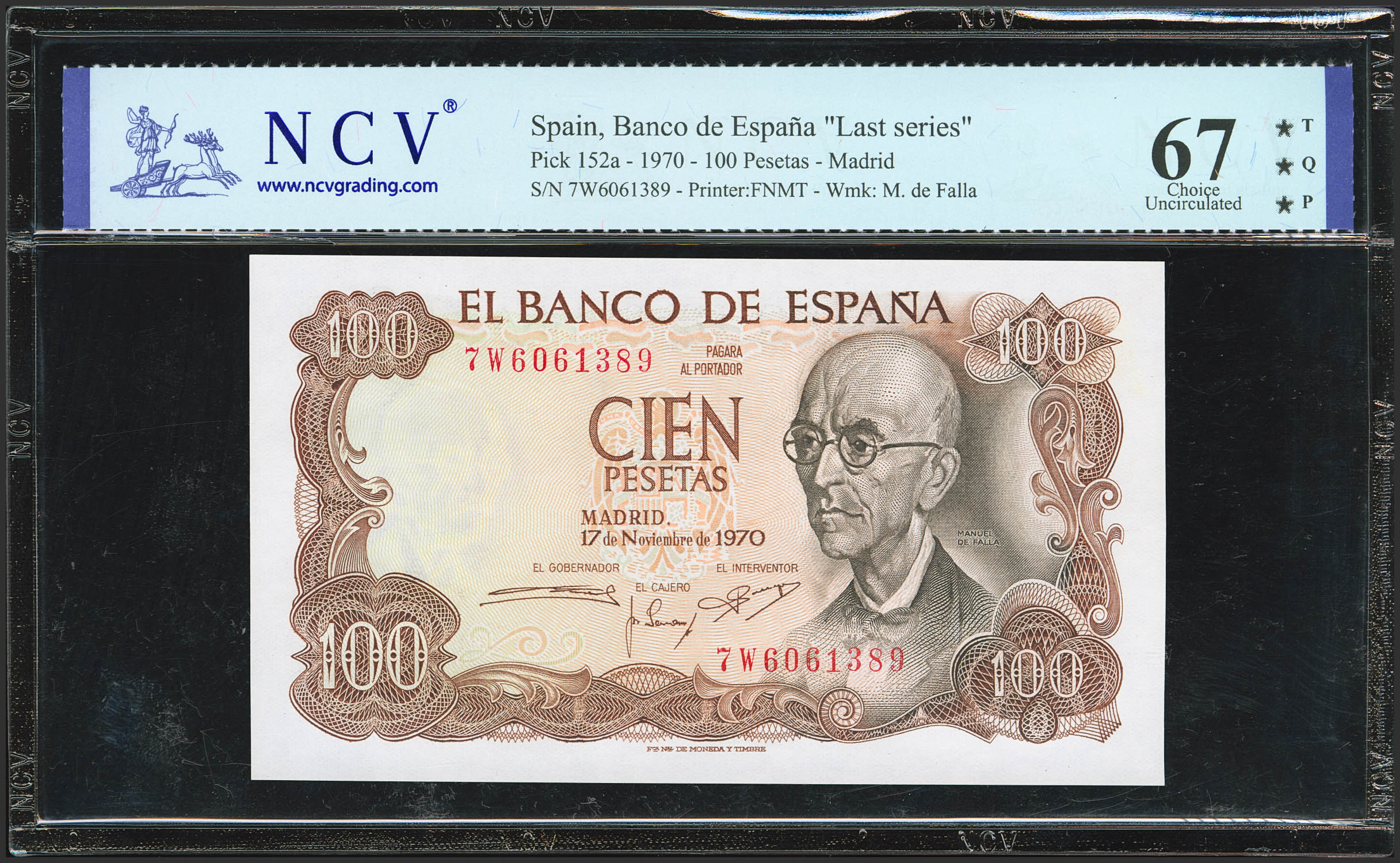 100 Pesetas. 17 de Noviembre de 1970. Serie 7W, última serie emitida. (Edifil 2023: 472c, Pick: 152a). Apresto original. SC. Encapsulado NCV67TQP.
