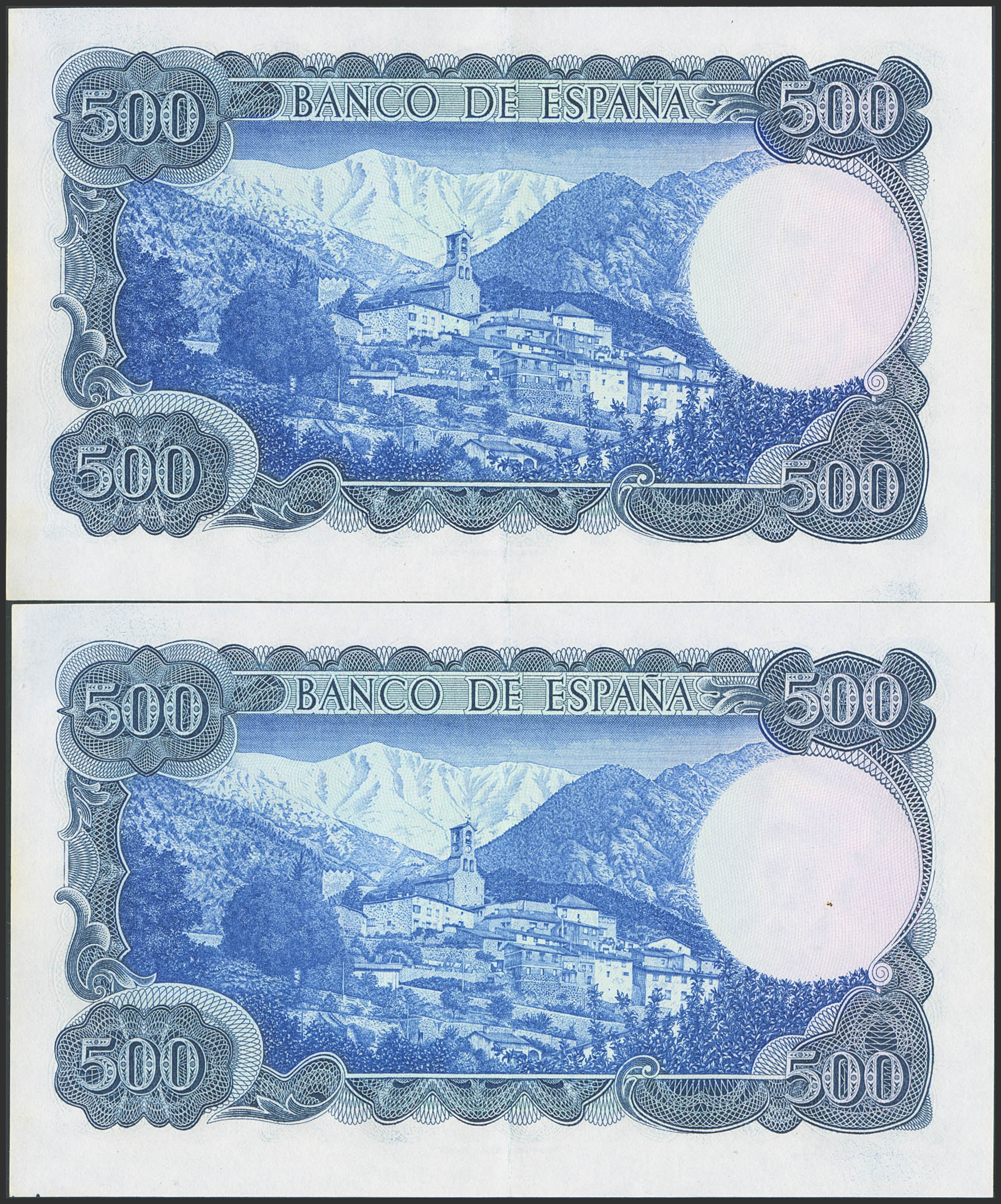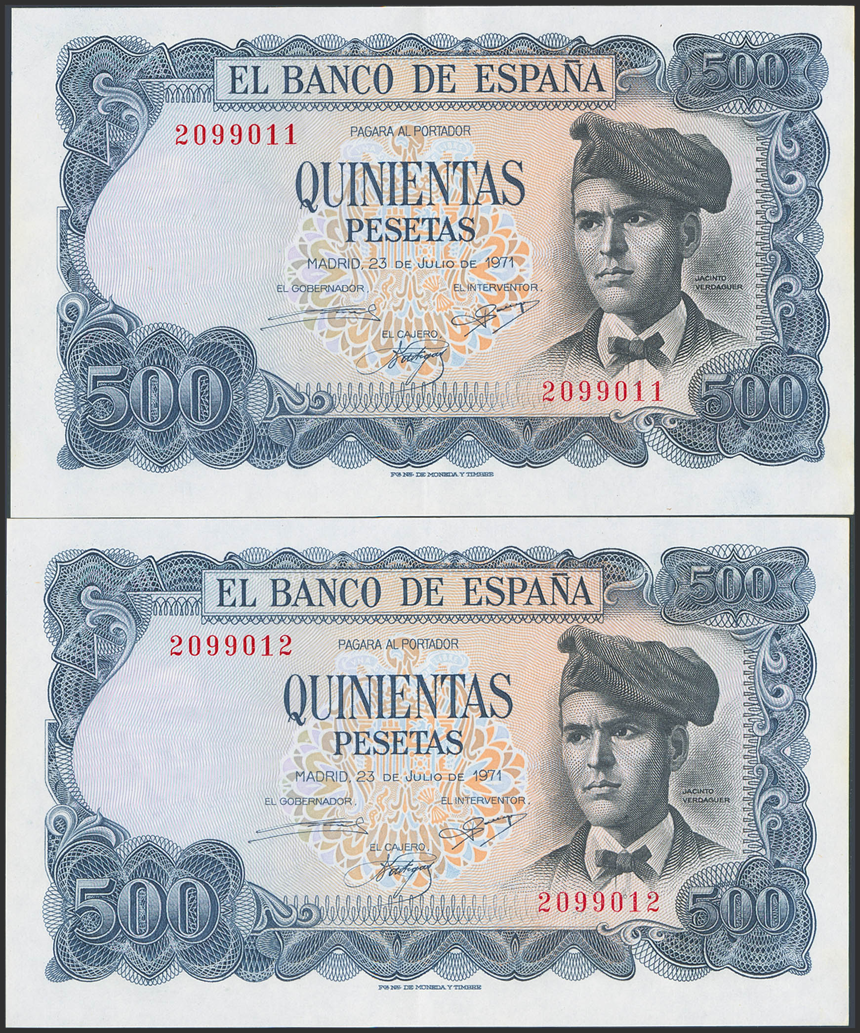500 Pesetas. 23 de Julio de 1971. Pareja correlativa. Sin serie. (Edifil 2021: 473). Apresto original. EBC++.