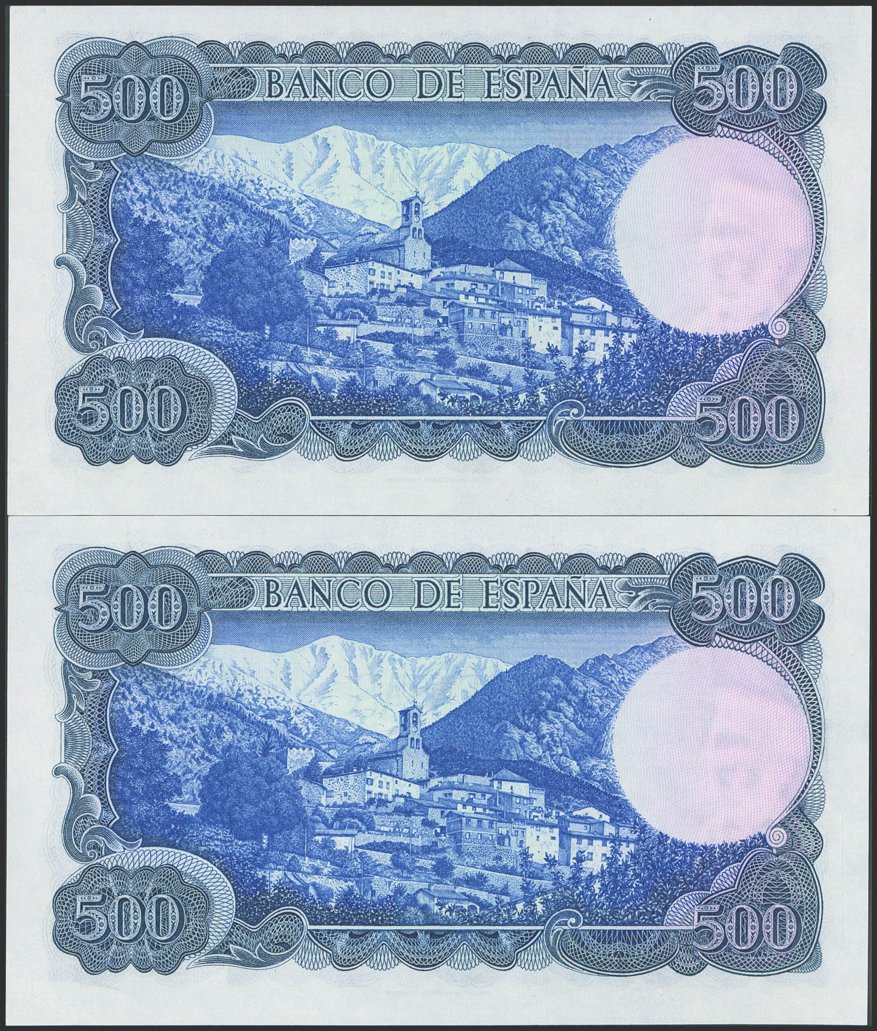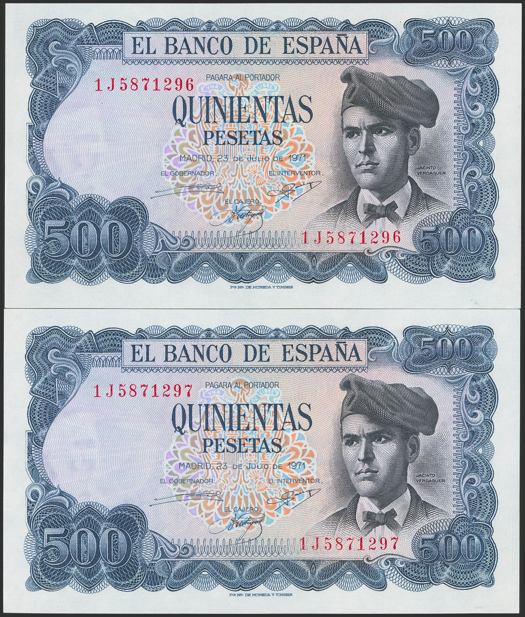 500 Pesetas. 23 de Julio de 1971. Pareja correlativa. Serie 1J. (Edifil 2023: 473a). Apresto original. SC.