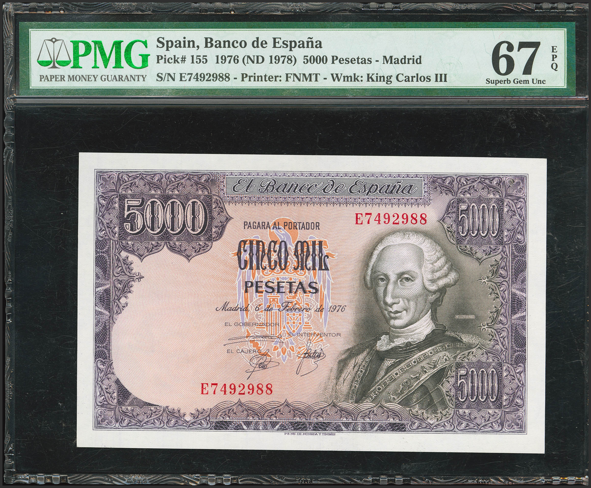 5000 Pesetas. 6 de Febrero de 1976. Serie E. (Edifil 2023: 475a, Pick: 155). SC. Encapsulado PMG67EPQ.