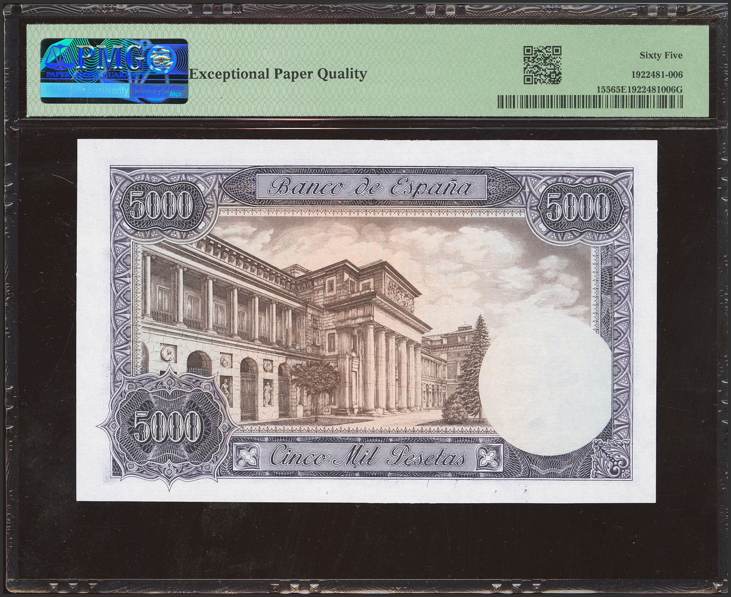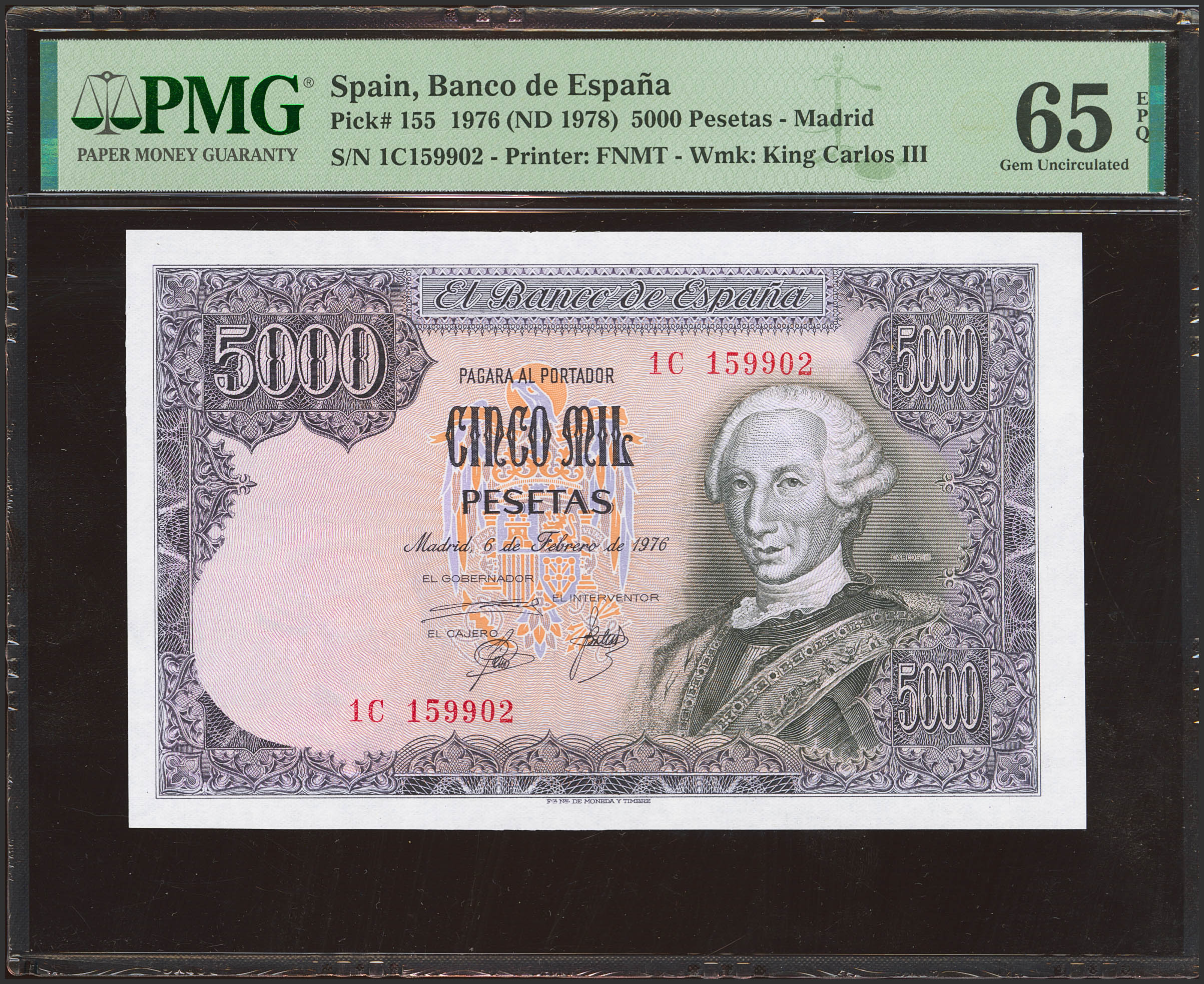 5000 Pesetas. 6 de Febrero de 1976. Serie 1C, última serie emitida. (Edifil 2023: 475aa, Pick: 155). Extraordinariamente rara serie, especialmente en esta excepcional calidad. SC. Encapsulado PMG65EPQ.