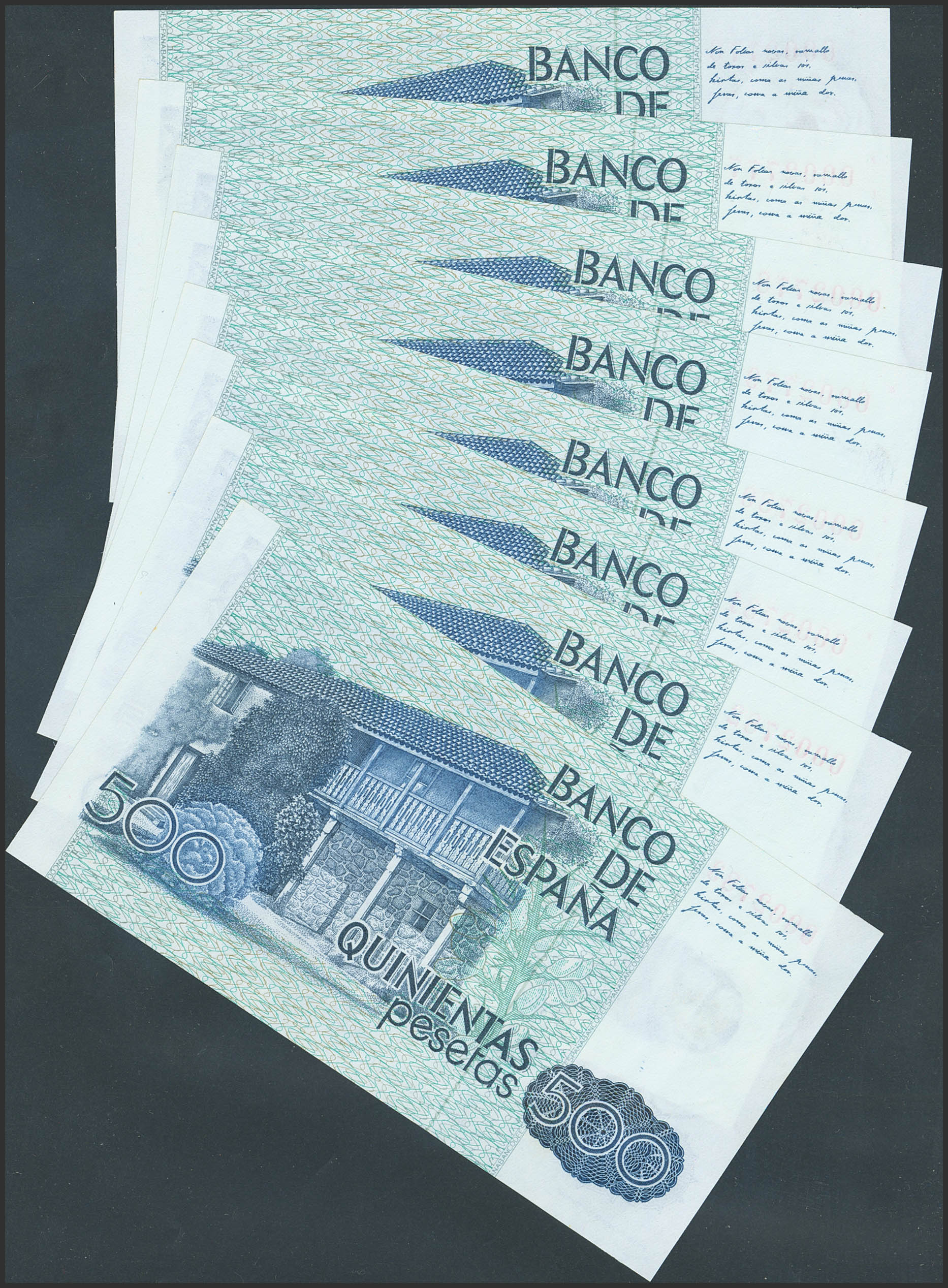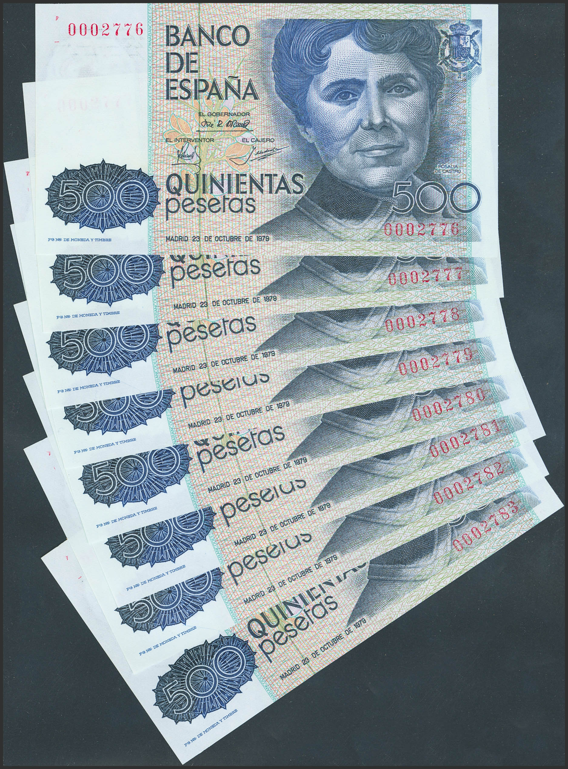 Conjunto de 8 billetes correlativos de 500 Pesetas emitidos el 23 de Octubre de 1979, todos ellos sin serie y numeración baja. (Edifil 2023: 476). SC.