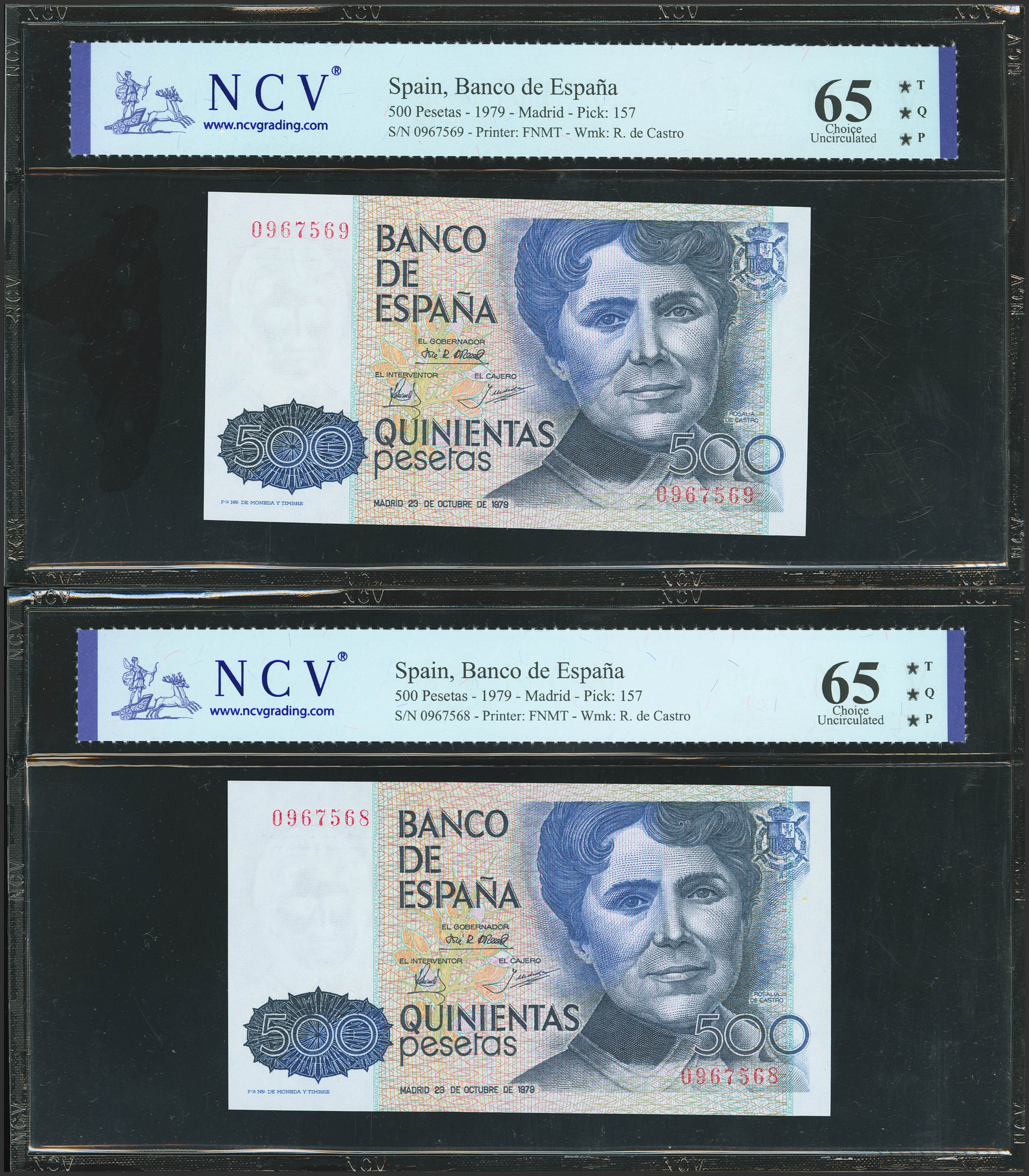 500 Pesetas. 23 de Octubre de 1979. Pareja correlativa. Sin serie. (Edifil 2023: 476, Pick: 157). SC. Encapsulados NCV65TQP, ambos.