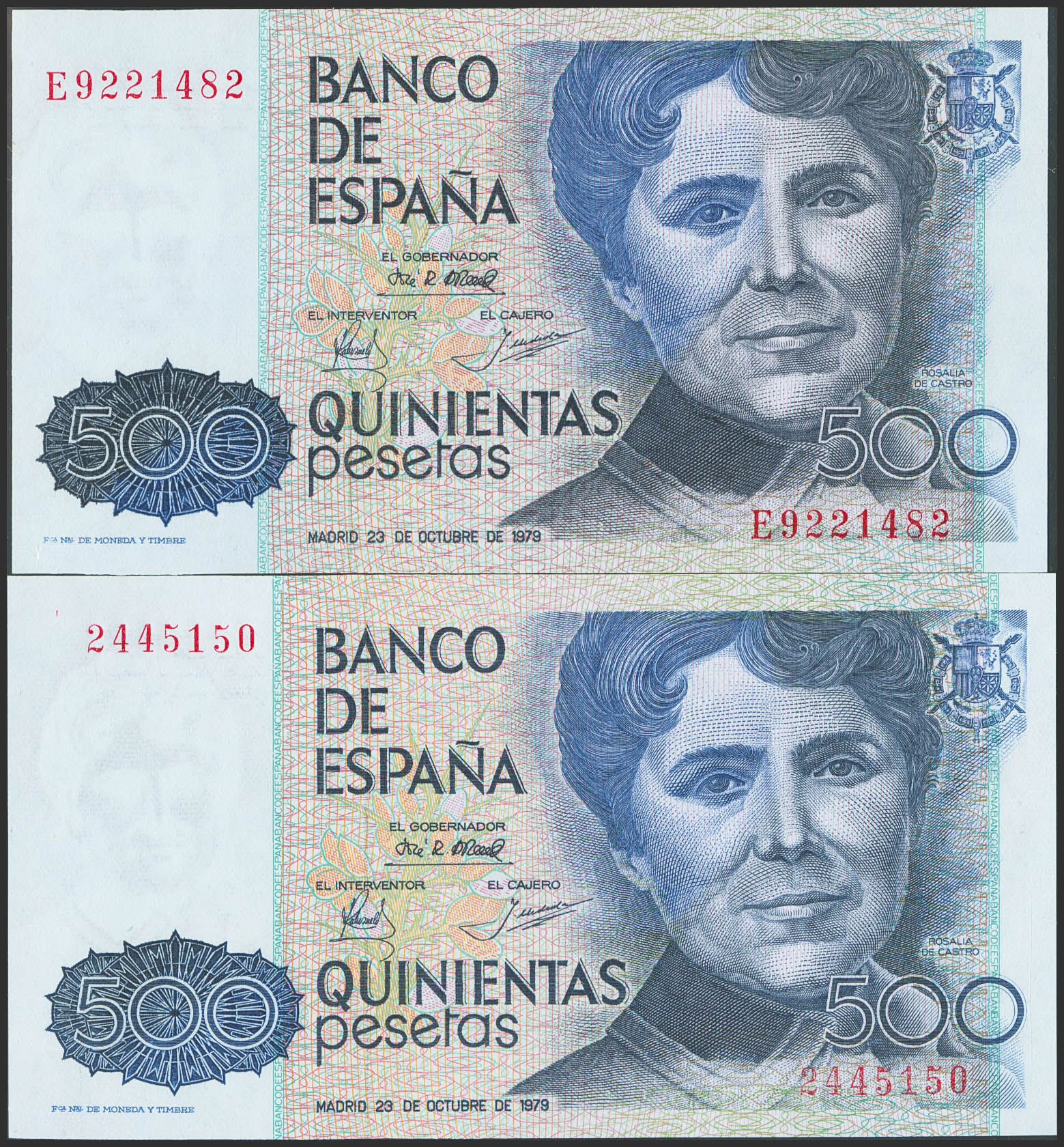 Conjunto de 2 billetes de 500 Pesetas emitidos el 23 de Octubre de 1979, sin serie y serie E. (Edifil 2023: 476. 476a). SC/EBC+++.
