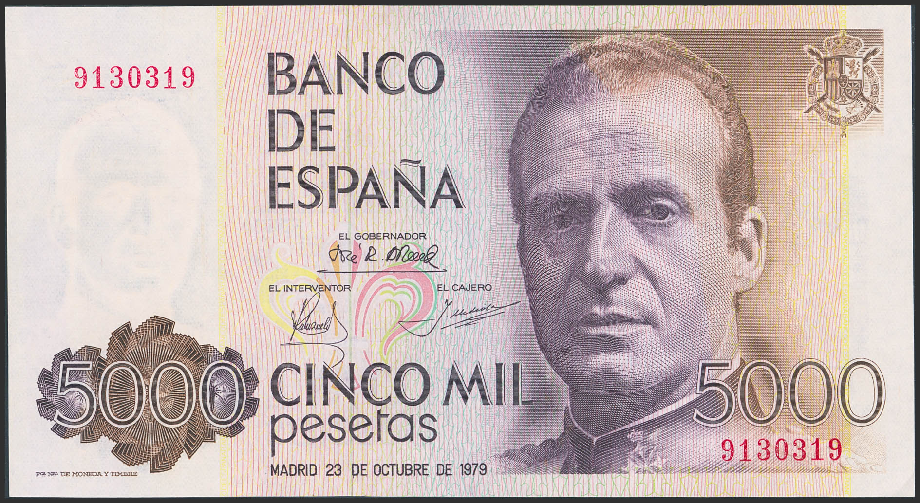 5000 Pesetas. 23 de Octubre de 1979. Sin serie y numeración capicúa. (Edifil 2021: 478). SC.