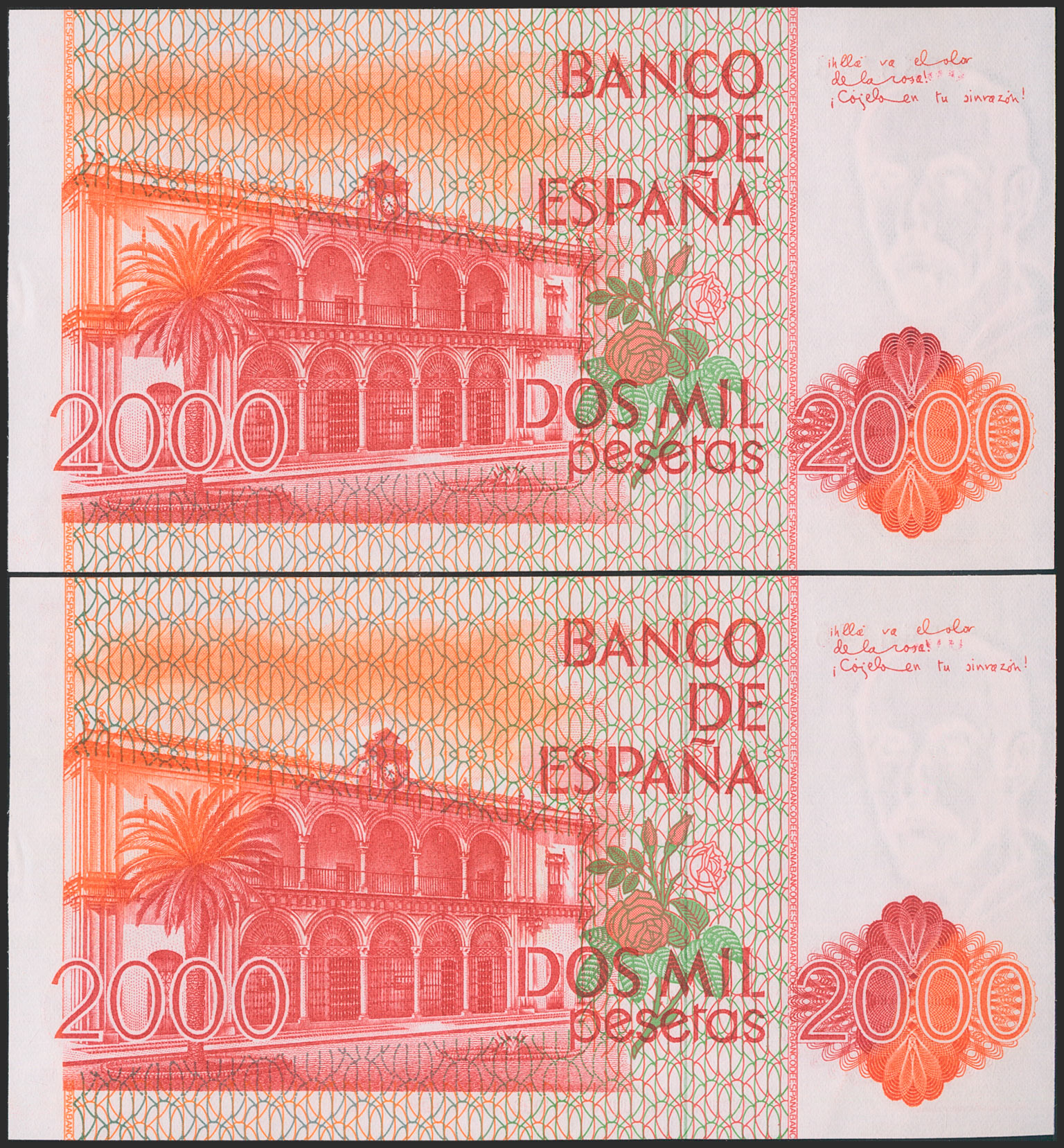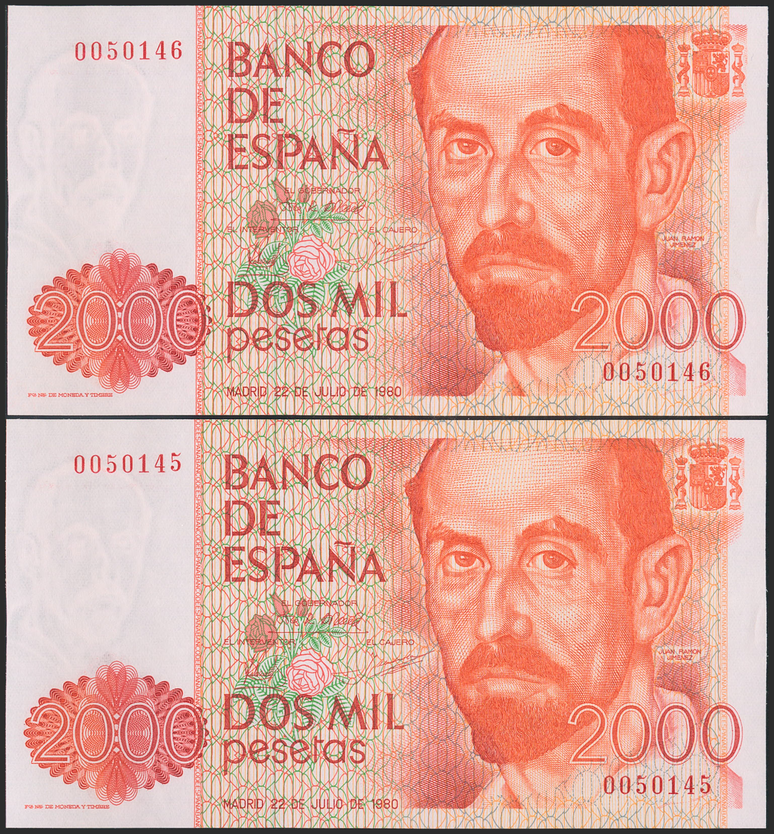2000 Pesetas. 22 de Julio de 1980. Pareja correlativa. Sin serie y numeración muy baja. (Edifil 2021: 479). SC/SC-.